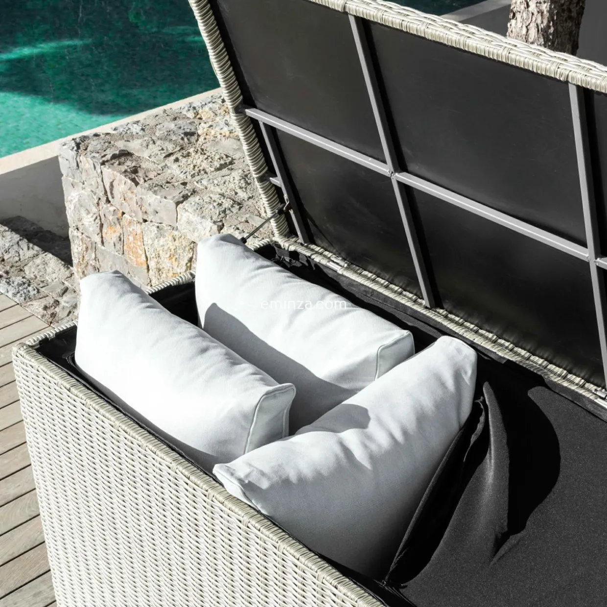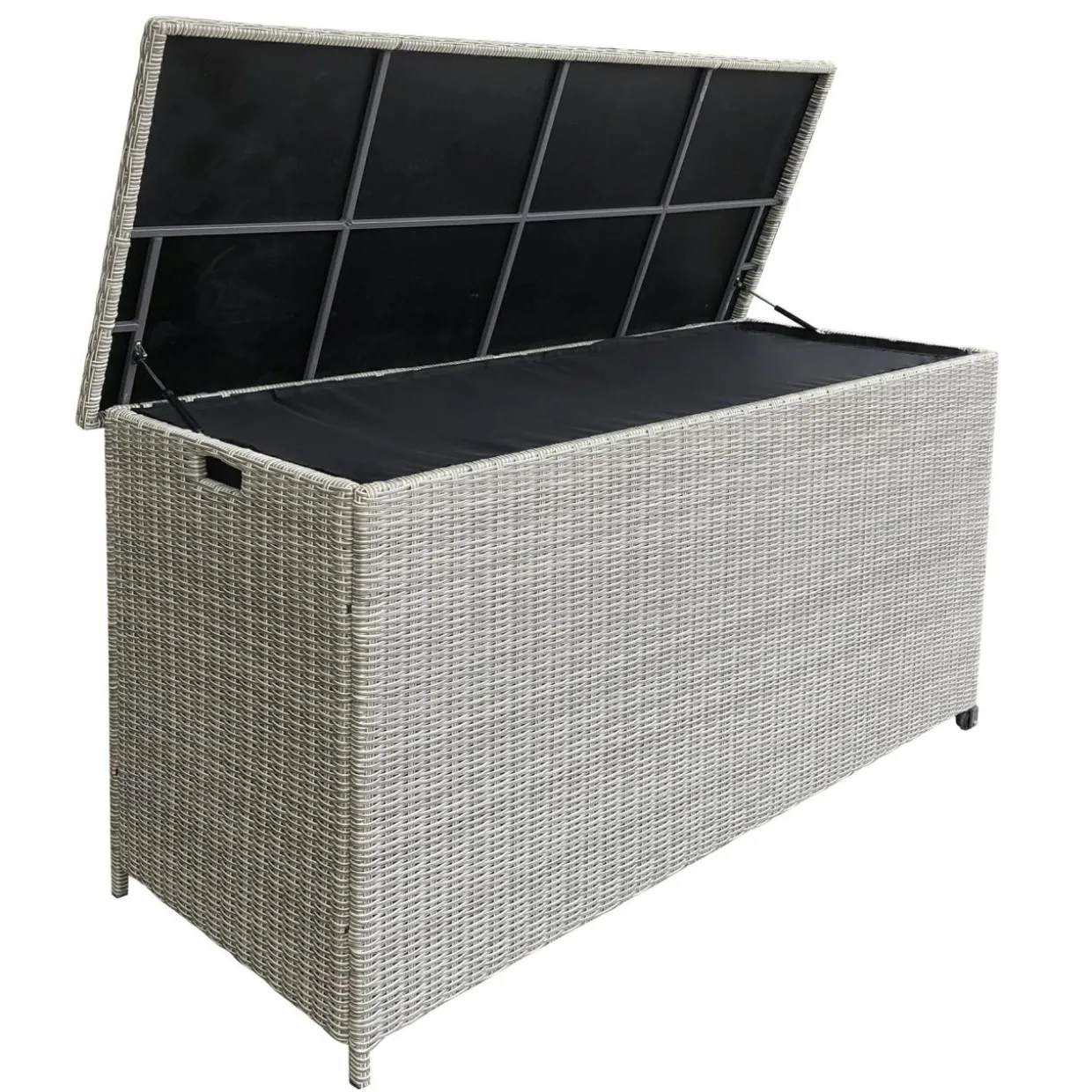 Grâce à la grande capacité de ce coffre, vous allez pouvoir ranger tous les coussins de votre salon de jardin Calvi 7 places. De plus, son panneau en plastique et sa housse en polyester entièrement refermable, empêcheront l’eau de s’inflitrer. Pratique, il est muni de roulettes, d’une poignée sur le côté et s’ouvre sur le dessus.