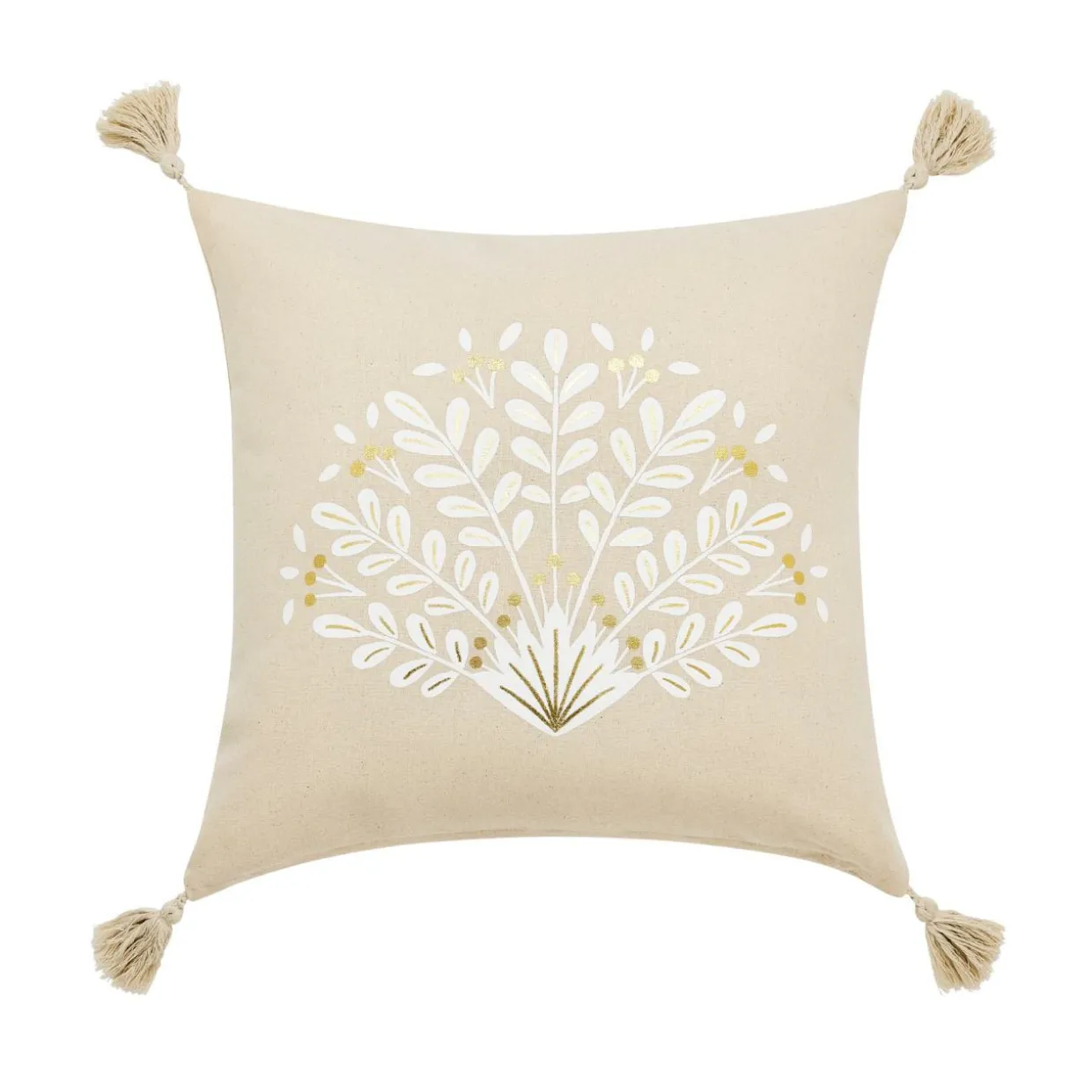Imprimé : coussin à motif végétal métallisé au recto et uni au verso.