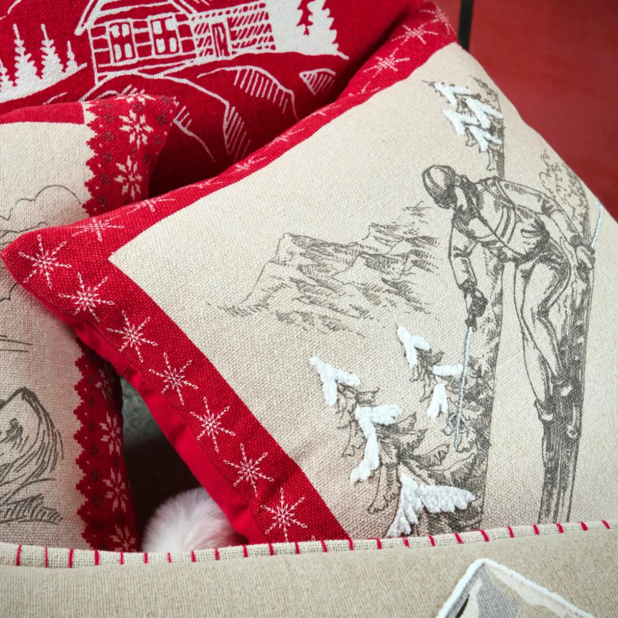 Imprimé : coussin à motif skieur au recto et uni au verso.
