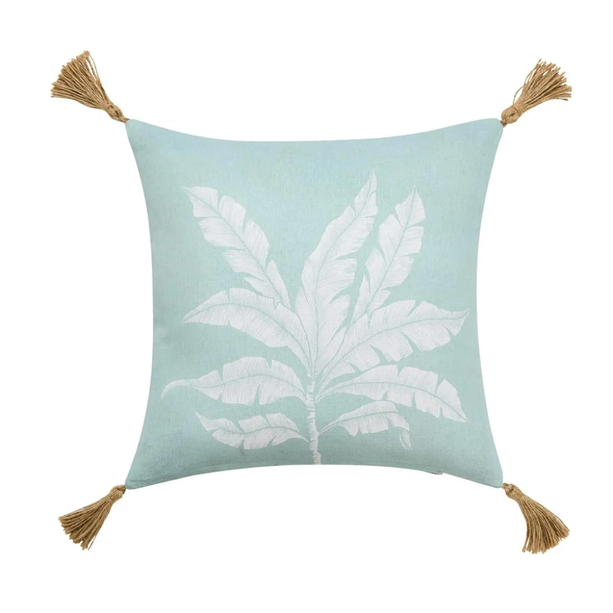 Imprimé : coussin à motif exotique au recto et uni au verso.