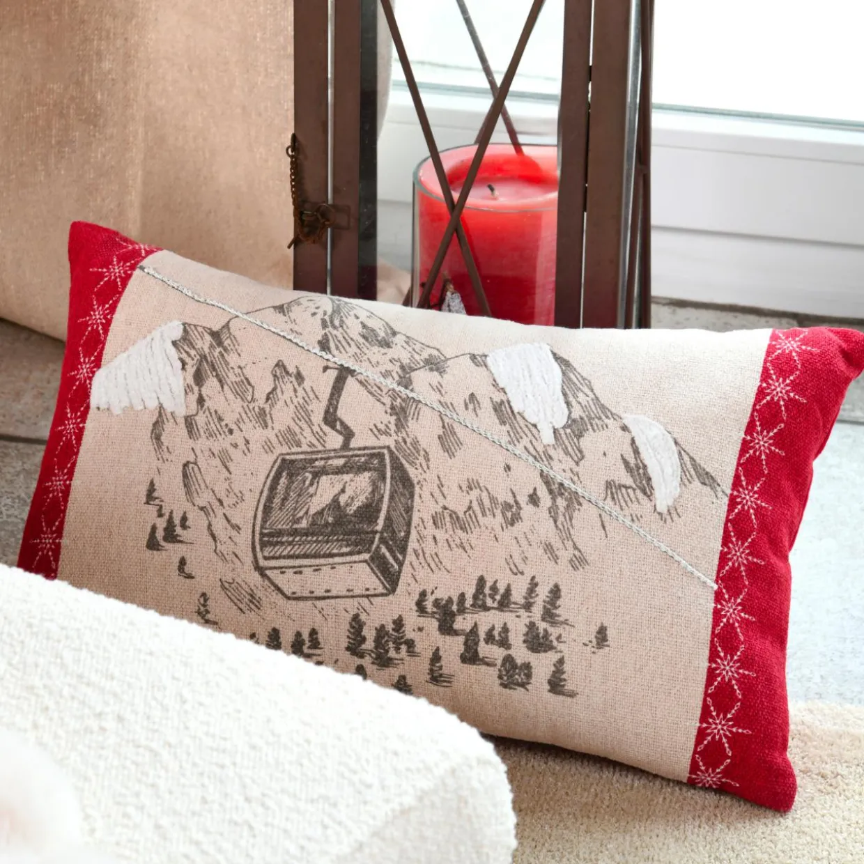 Imprimé : motif station de ski au recto et uni au verso.