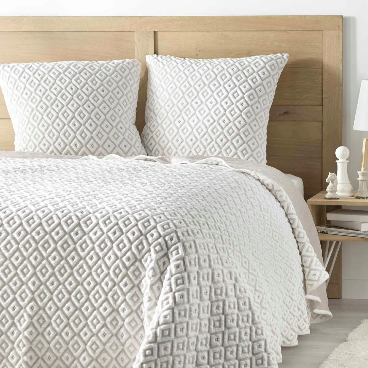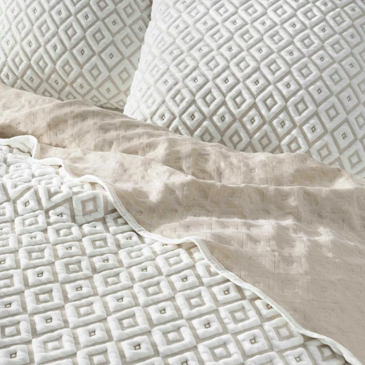 Imprimé : couvre-lit à motif graphique beige et blanc.