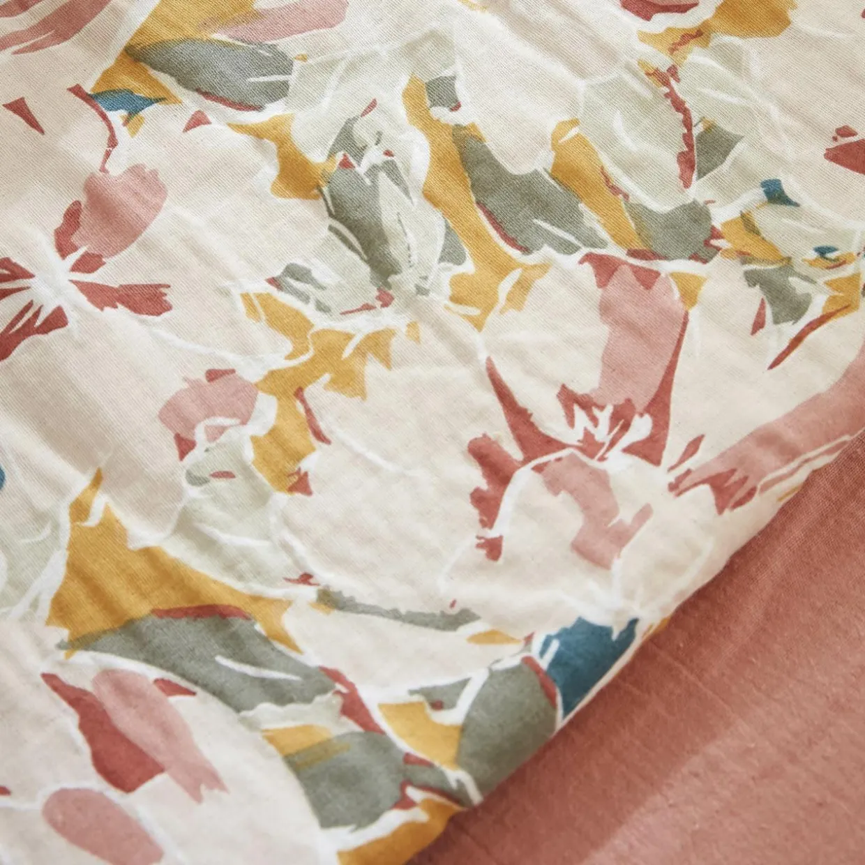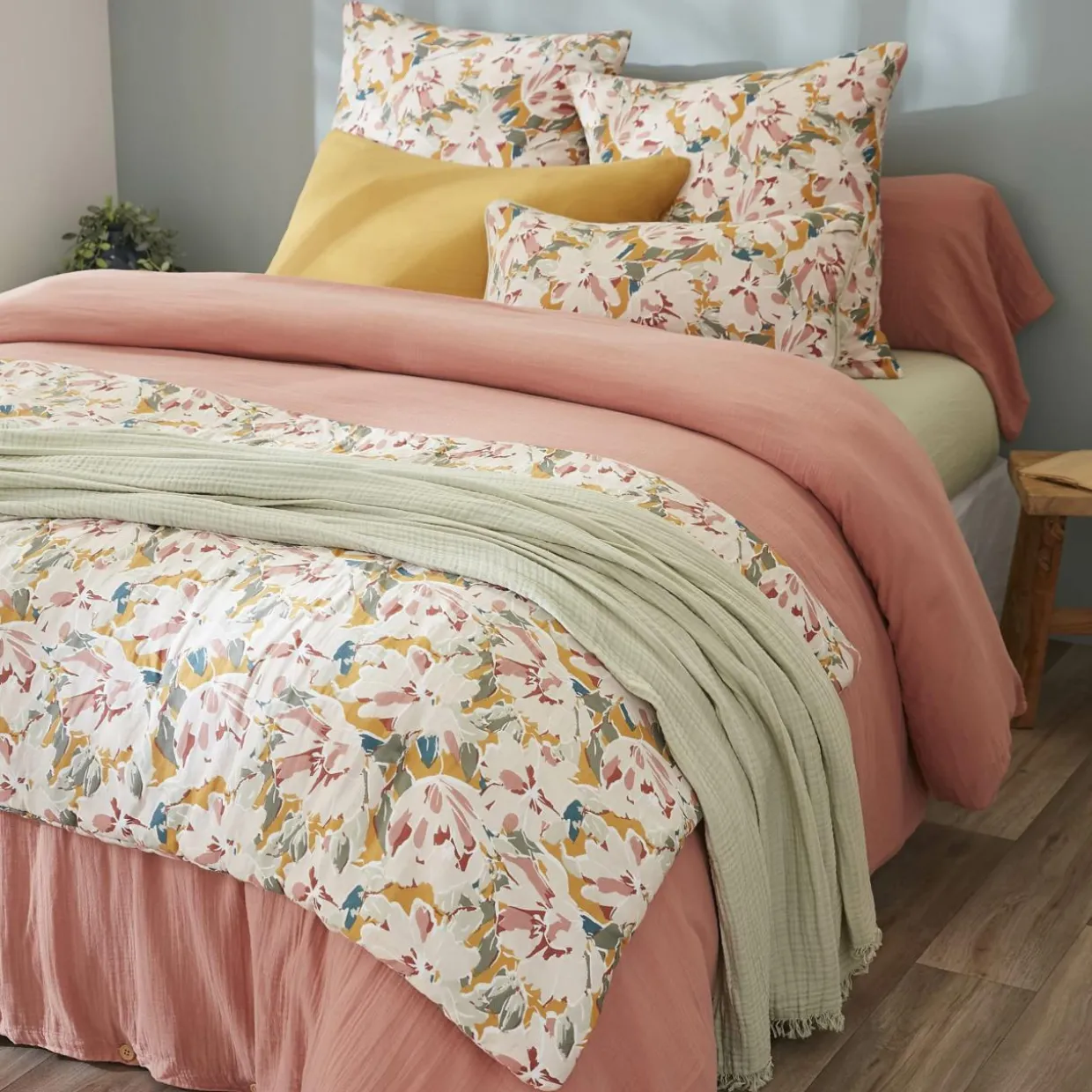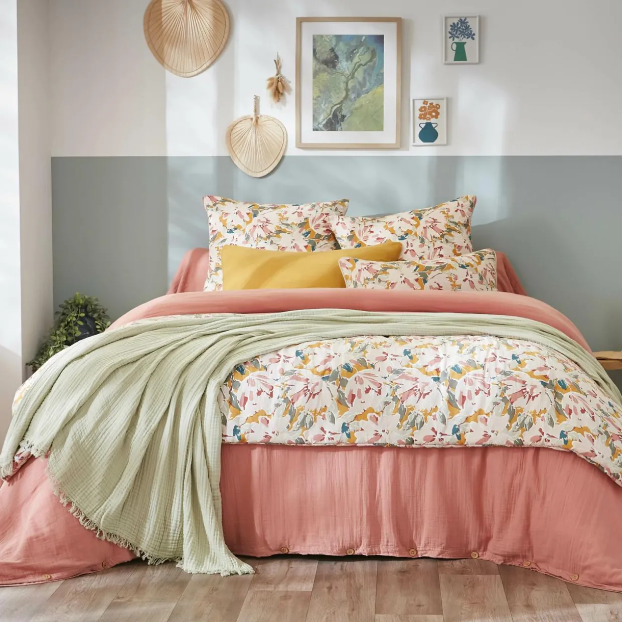 Confectionné en double gaze de coton, il séduit par ses motifs floraux délicats et ses couleurs claires, parfaites pour insuffler un esprit printanier dans le décor.