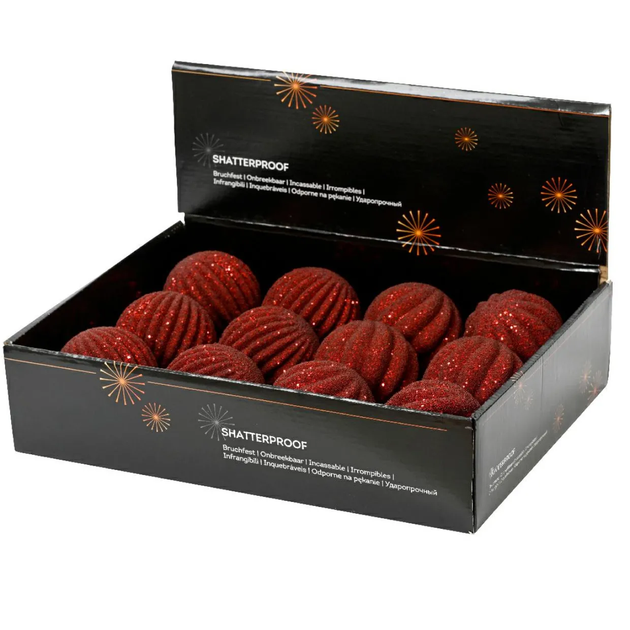 Informations complémentaires : lot de 12 boules de Noël. Chaque boule est munie d’une suspension dorée incluse.