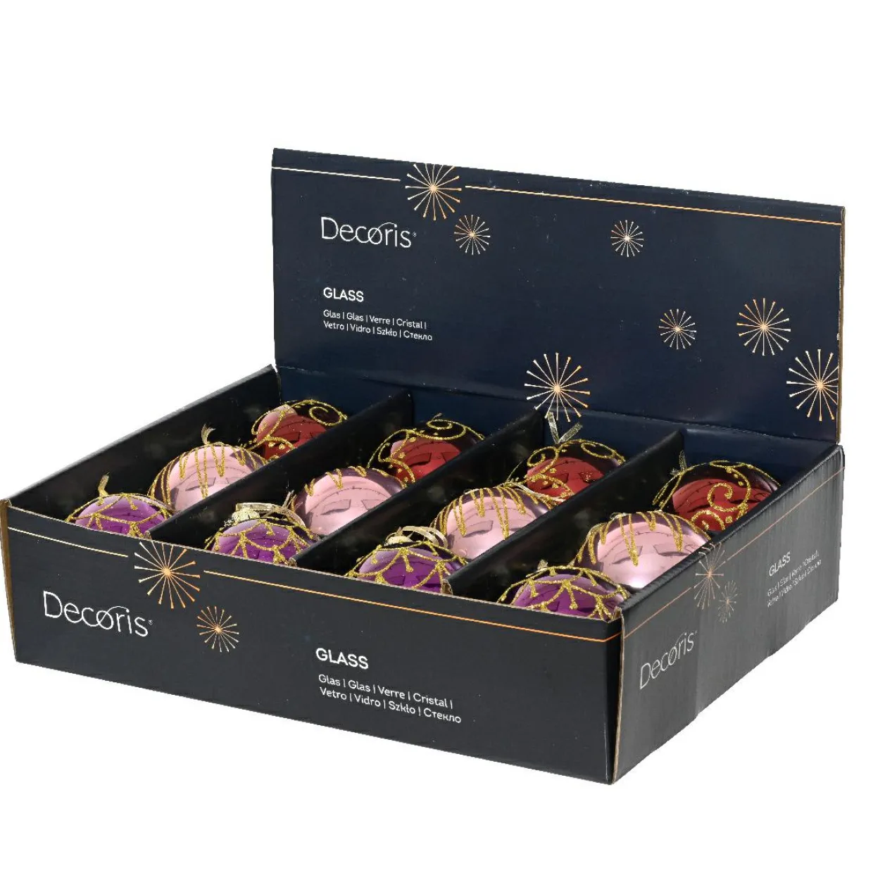 Informations complémentaires : lot de 12 boules de Noël. 4 boules de chaque couleur avec motif paillettes dorées. Suspension comprise, couleur attache or.