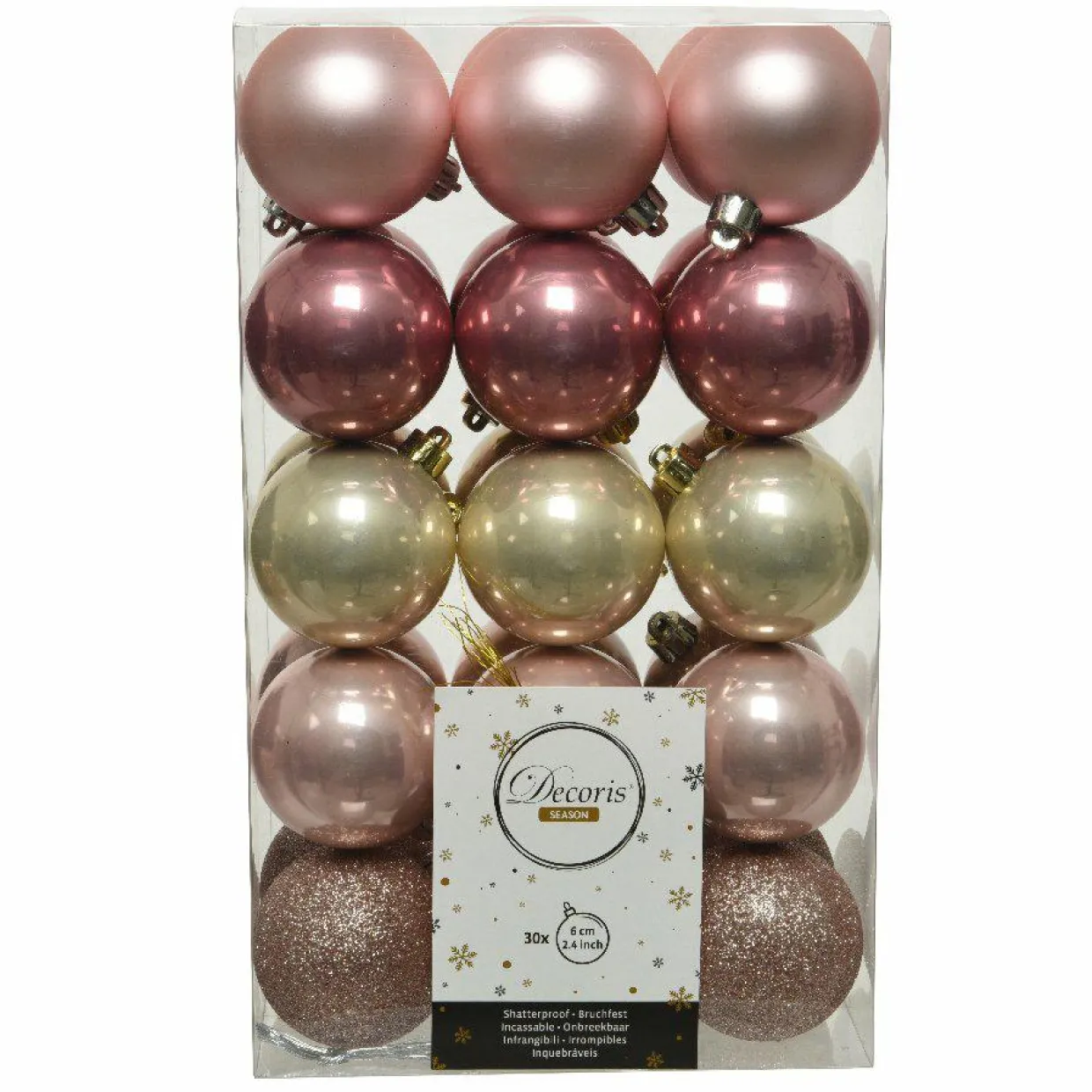 Composition du lot : 12 boules pailletées, 12 boules brillantes et 6 boules mates.