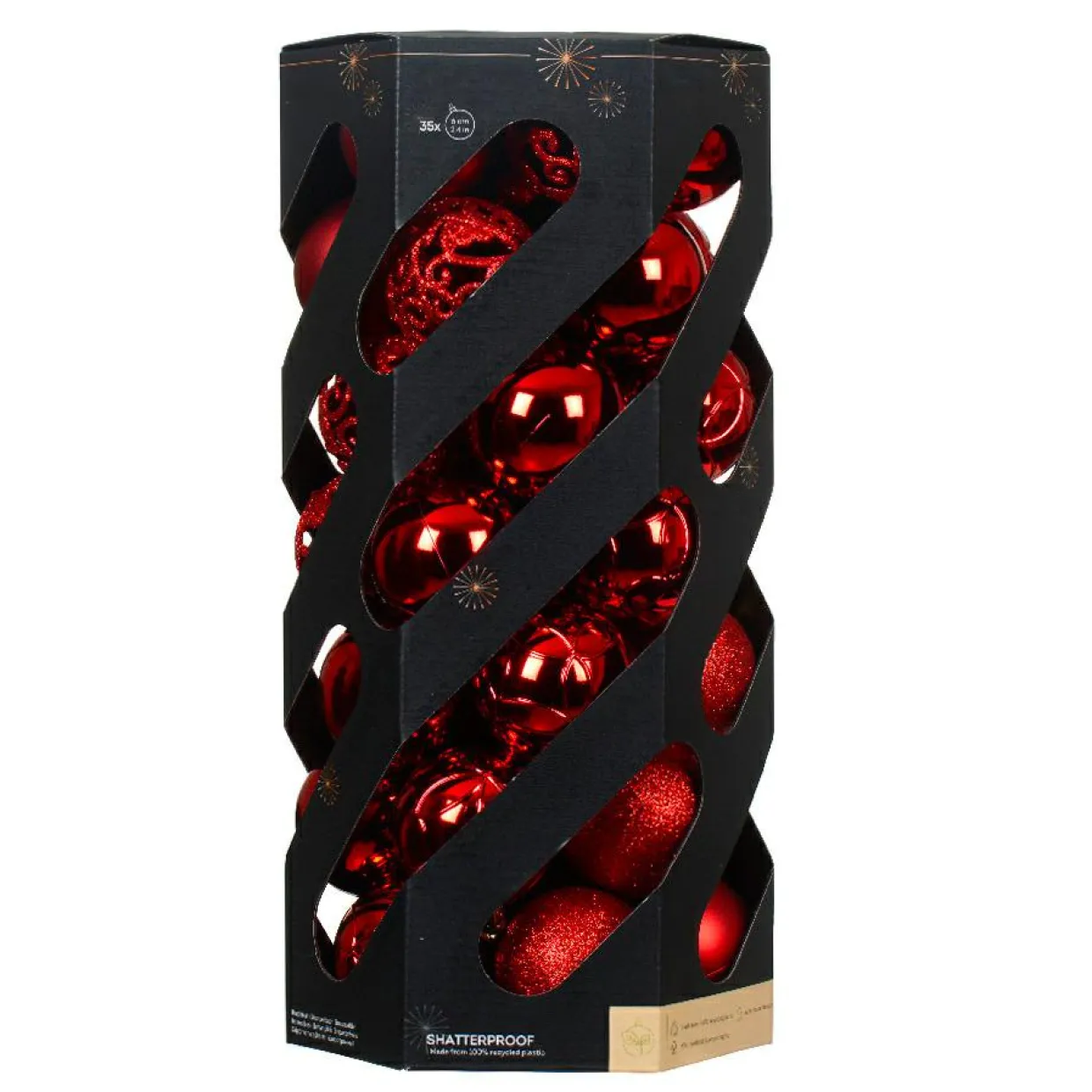 Informations complémentaires : lot de 35 boules comprenant 7 boules brillantes, 7 boules pailletées, 7 boules brillantes en relief, 7 boules ajourées arabesque et 7 boules mates. Les boules sont munies d’une suspension comprise de couleur or. Emballage en matériau recyclé norme FSC.