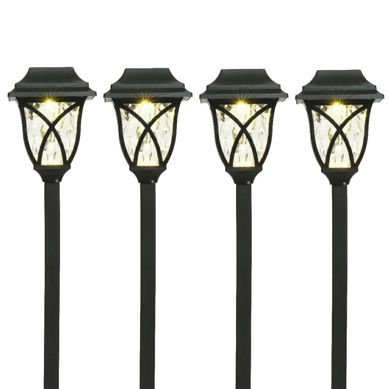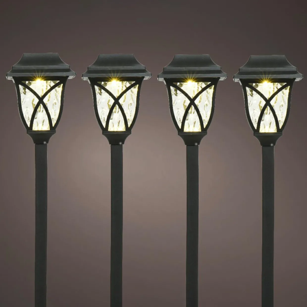 Mode de fonctionnement : cette borne fonctionne à l’énergie solaire avec mode d’éclairage fixe. Luminosité active de 6 heures en saison printemps – été – automne / 3 heures en hiver. Possède un intterupteur ON/OFF. Batterie remplaçable. Panneau solaire amorphe – Voltage du panneau : 2 V. Batterie Ni-Mh AA – Voltage de la batterie 1,2 V. Possibilité de fixer la borne au sol avec piquet ou socle. Vendu par 4.