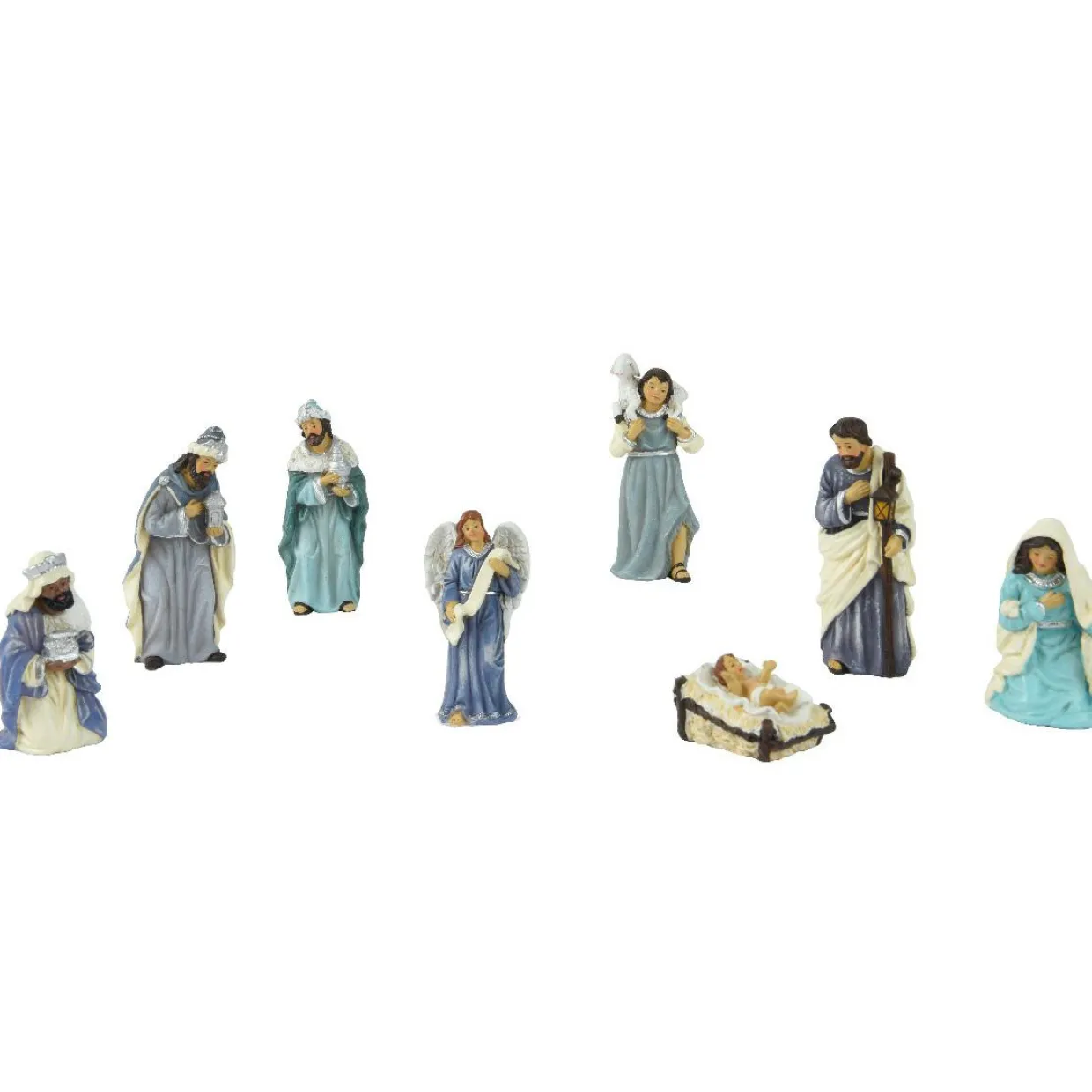 Ce lot de 8 santons de Clémence, peints dans des tons bleus, apportera une touche de couleur et d’originalité à votre décoration de Noël. Avec Marie, Joseph, Jésus, les trois rois mages, le berger et l’ange Gabriel, vous pouvez recréer la scène de la nativité dans votre salon, ajoutant une touche de chaleur et de spiritualité à vos festivités.