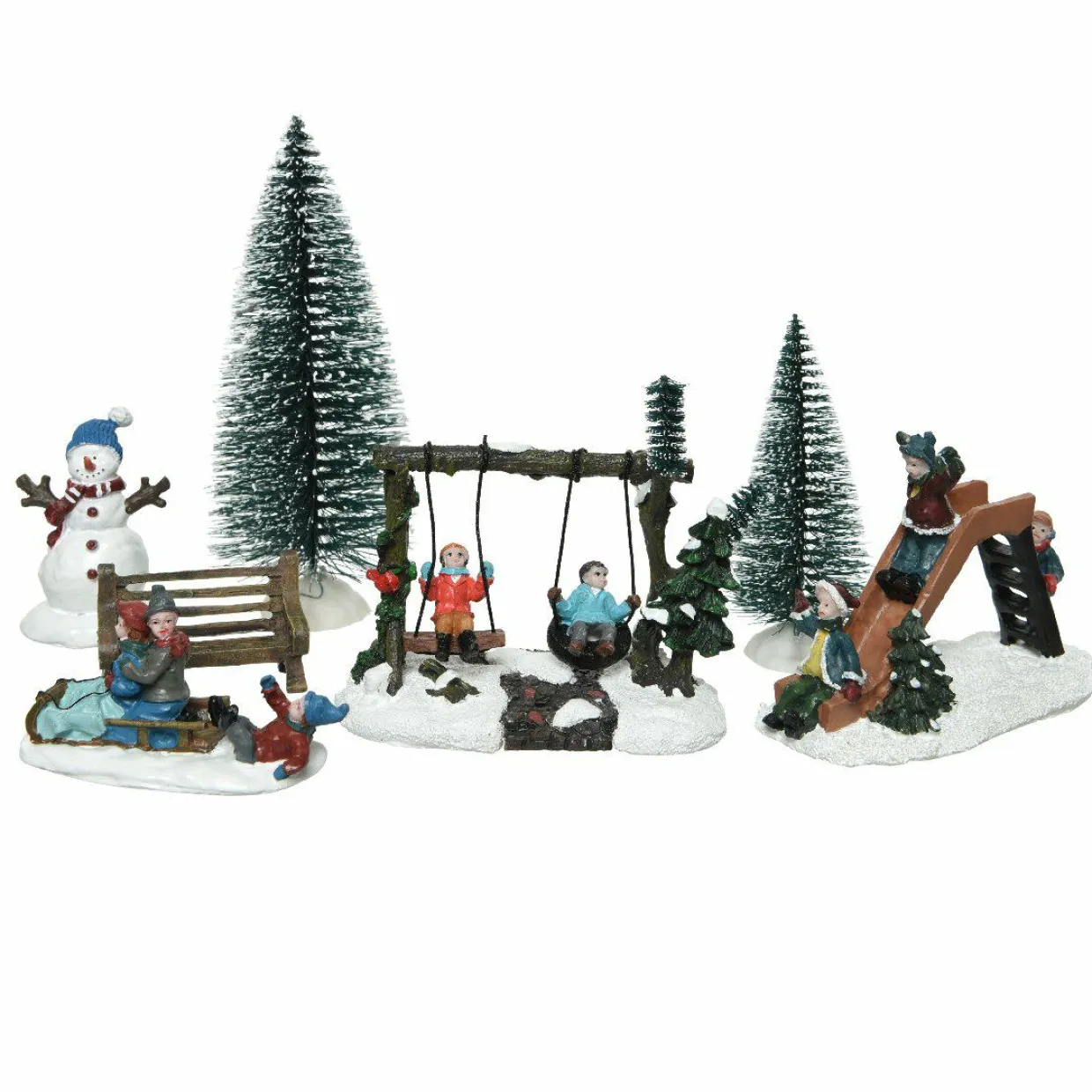 Composition du lot : Ce lot est composé des accessoires et personnages suivants : – grand arbre :7x7x15cm – petit arbre 4.5×4.5x10cm – banc: 5×2.5×3.5cm – bonhomme de neige 4.3x4x6.5cm – luge :8x4x5cm – balançoire 10.5×5.5x8cm – toboggan 12×5.5x8cm