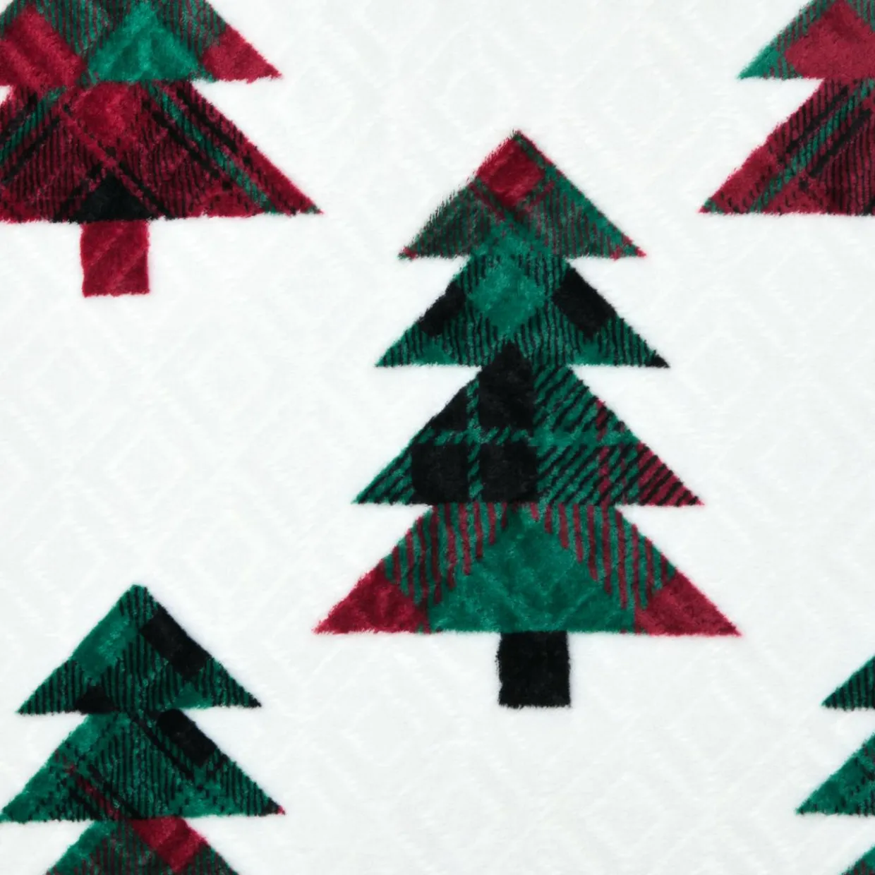 Couleur : fond blanc, motif sapins, carreaux tartan vert et rouge.