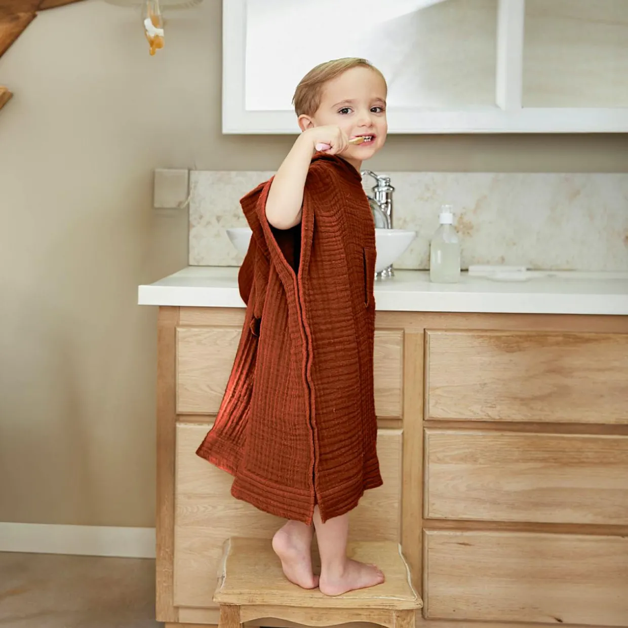 Tissé en 4 épaisseurs, ce poncho s’utilise aussi bien en sortie de bain qu’en surpyjama.