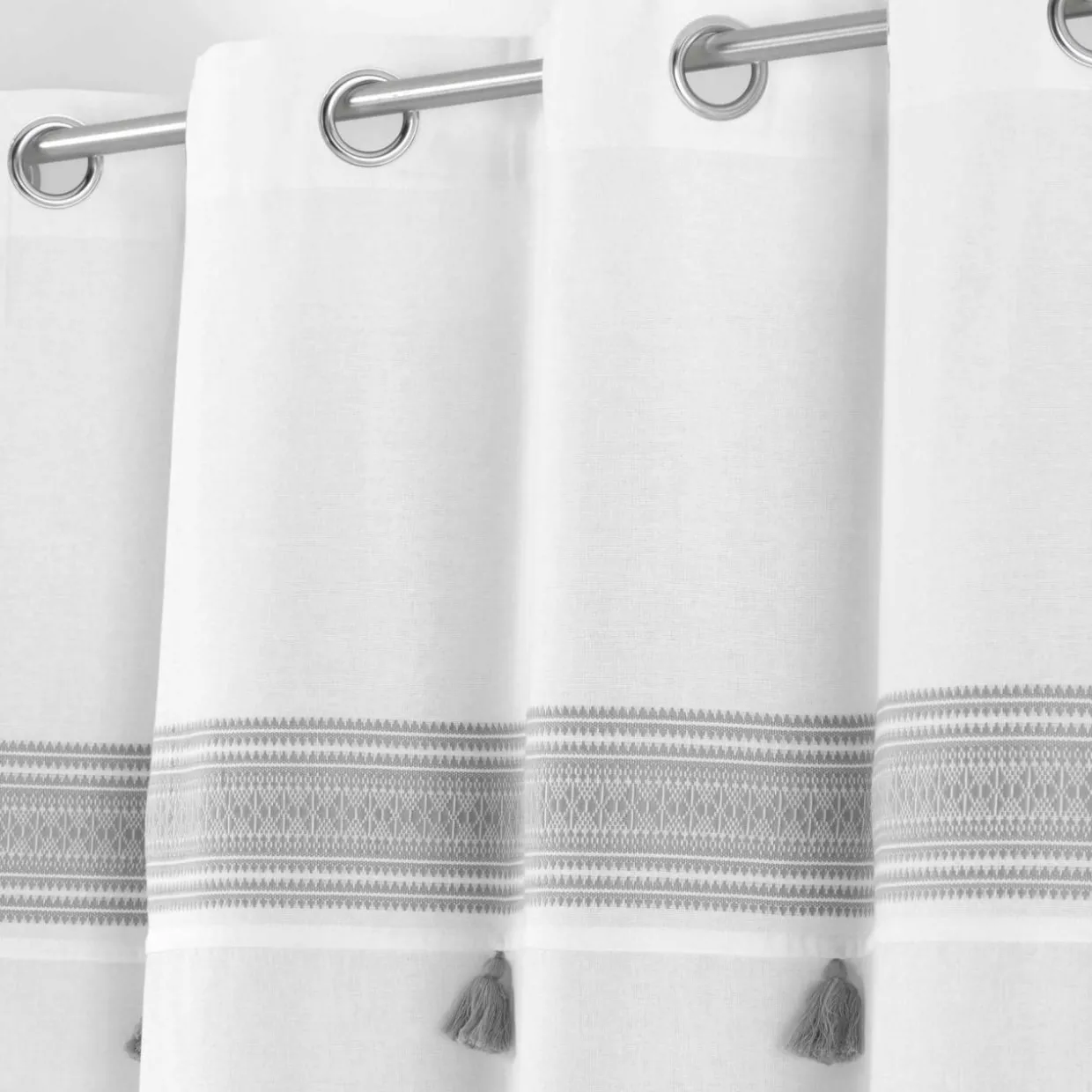 Imprimé : rideau à motif ethnique et à pompons.