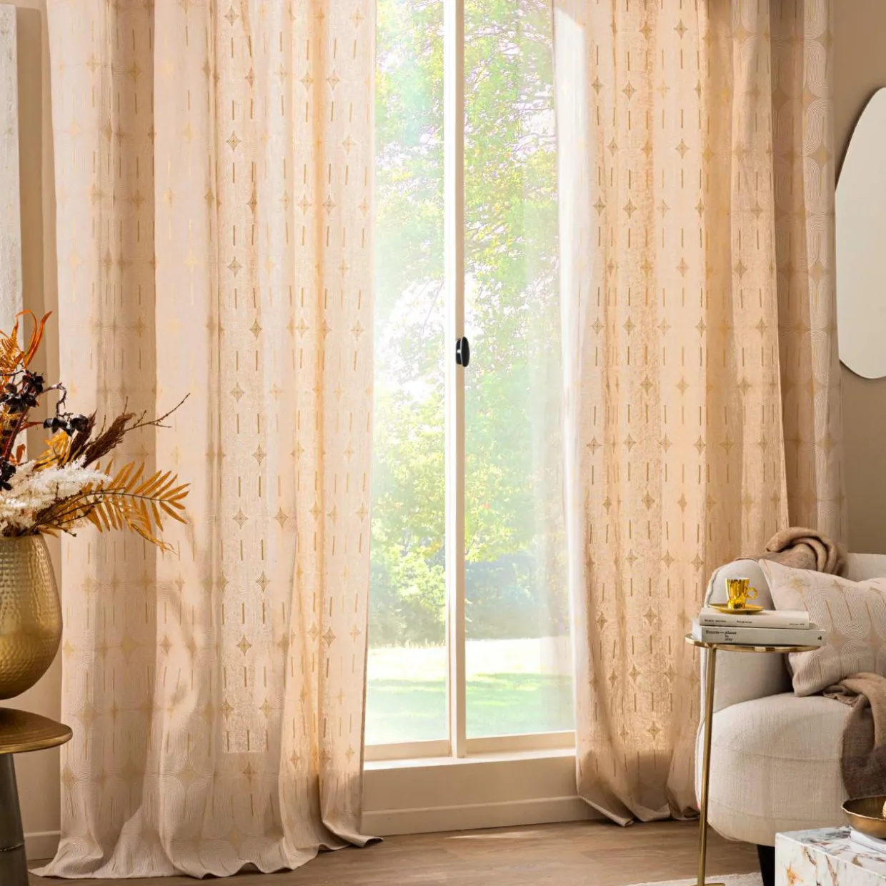 Ce rideau Ondine Blanc, en coton mélangé, apporte une touche d’élégance à votre intérieur. Son imprimé métallisé géométrique ajoute une note moderne et graphique à votre décoration.