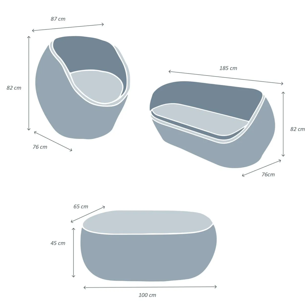 – Canapé 3 places : longueur 185 cm x profondeur 76 cm x hauteur 82 cm.