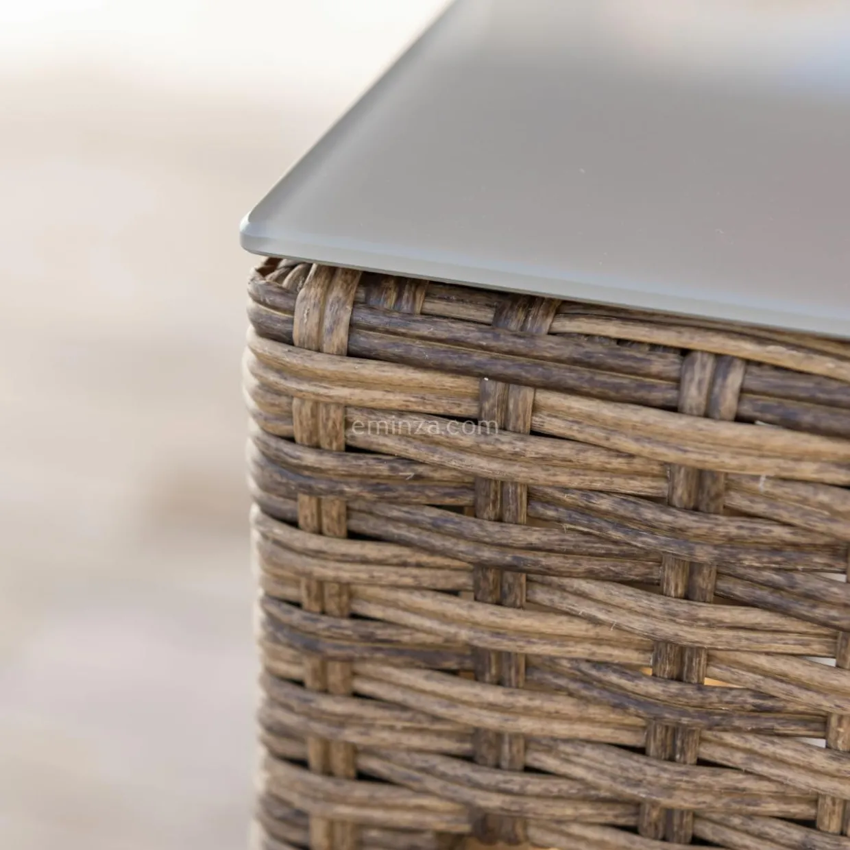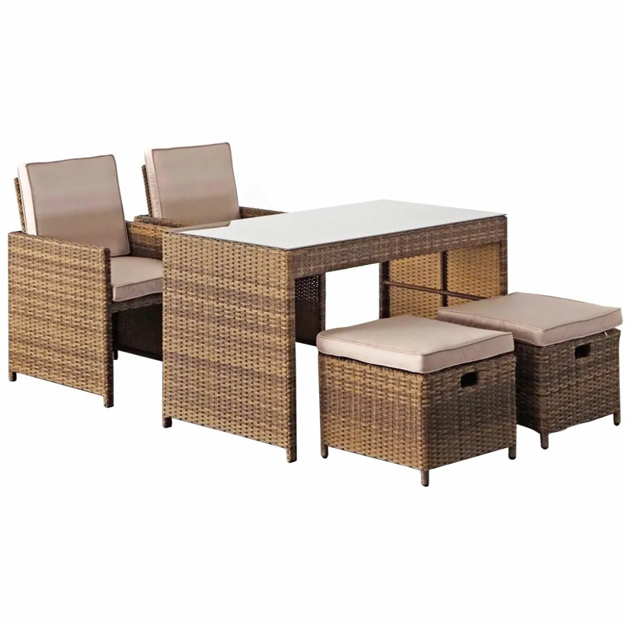 Il comprend : deux fauteuils, deux poufs et une table haute.