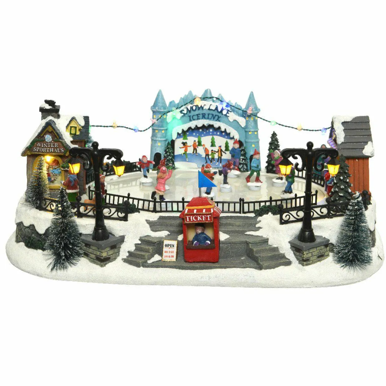 Ce village est équipé de 18 LED multicouleur non remplaçables, il est également musical et les personnages sur la patinoire sont en mouvement. La longueur du câble est de 180 cm.