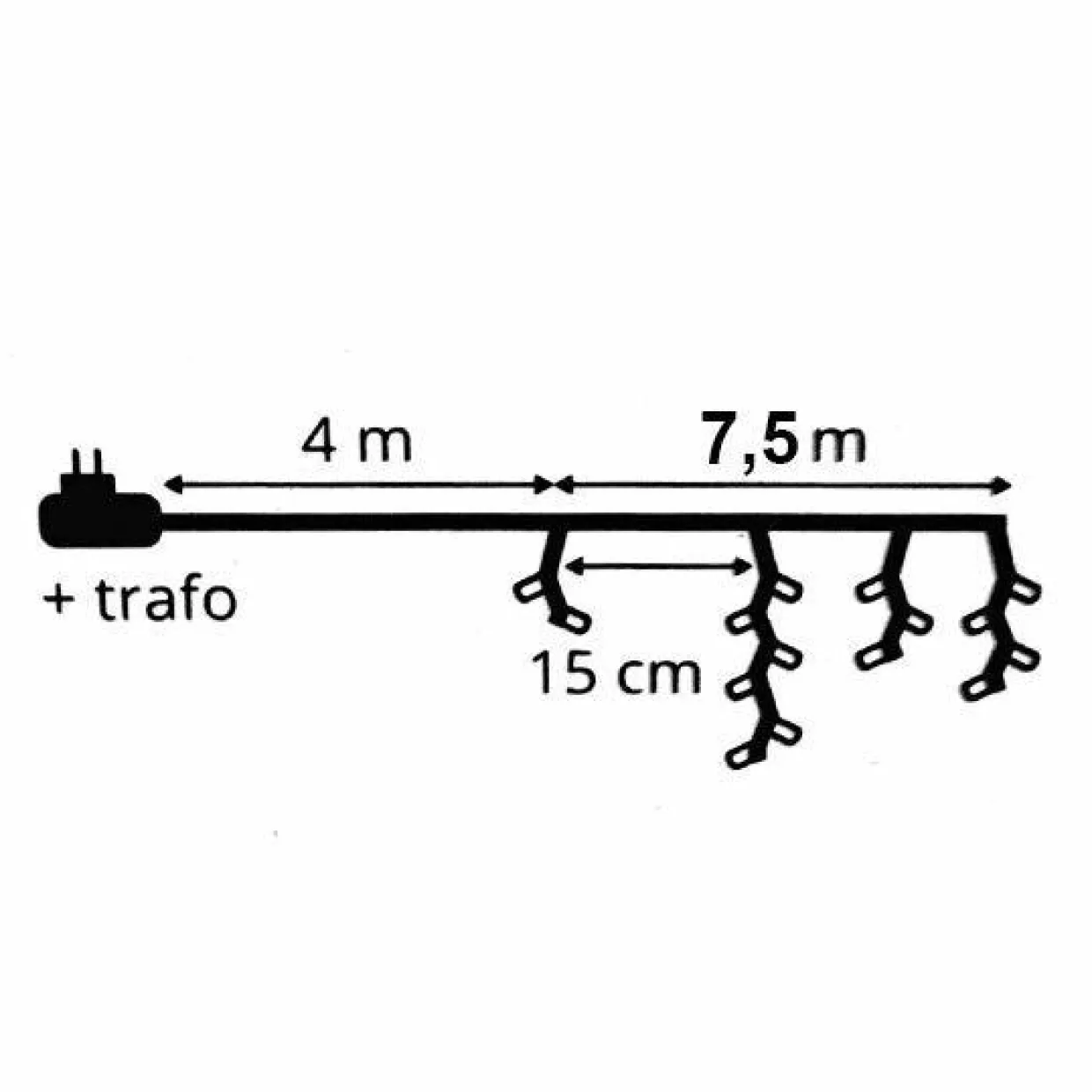 Mode de fonctionnement : stalactite lumineuse clignotante avec 8 jeux de lumière (dont une FIXE) et une fonction mémoire. Ce produit est muni d’un minuteur lui permettant de s’allumer 8 heures par jour automatiquement. À brancher sur une prise (transfo IP44 fourni). Utilisation intérieure et extérieure.