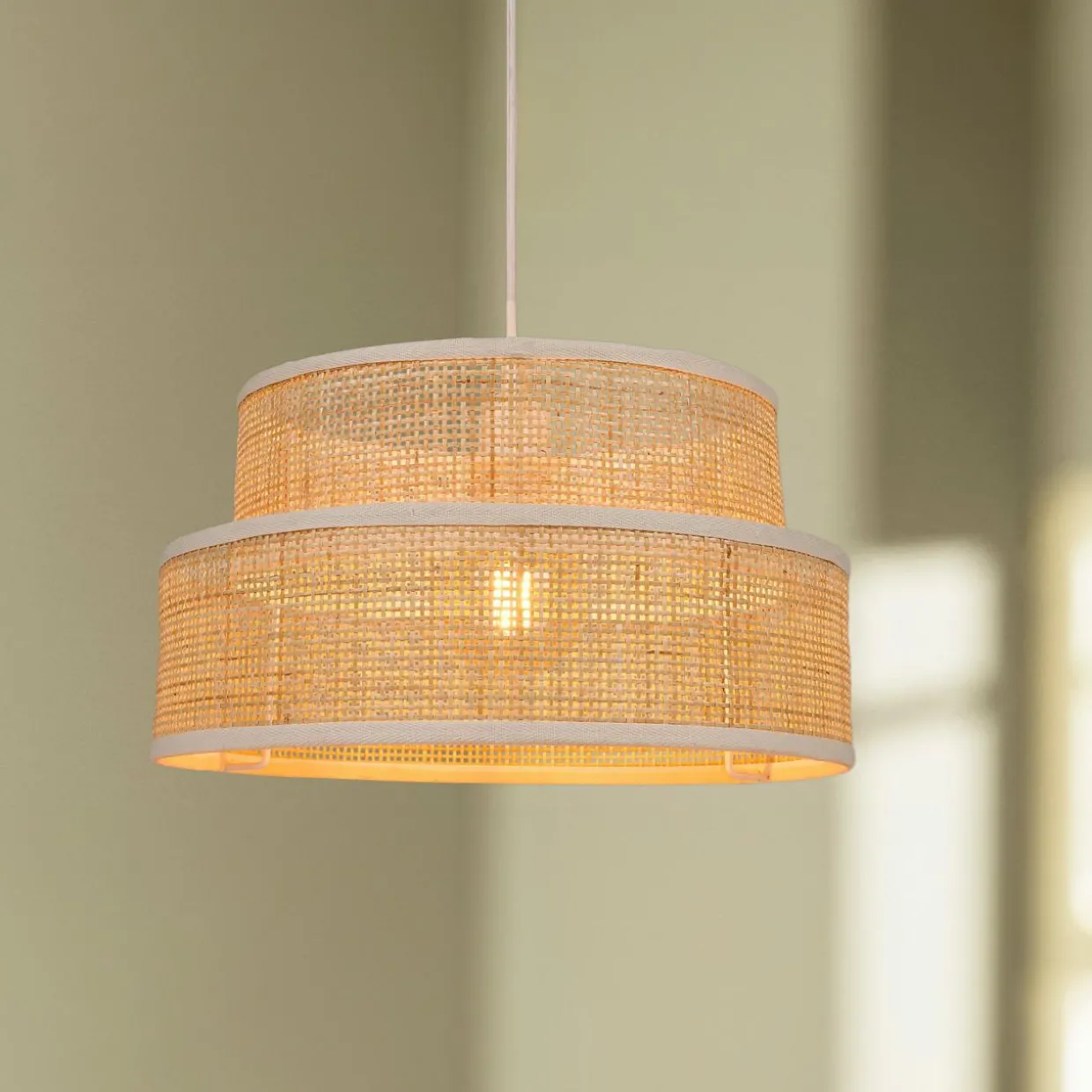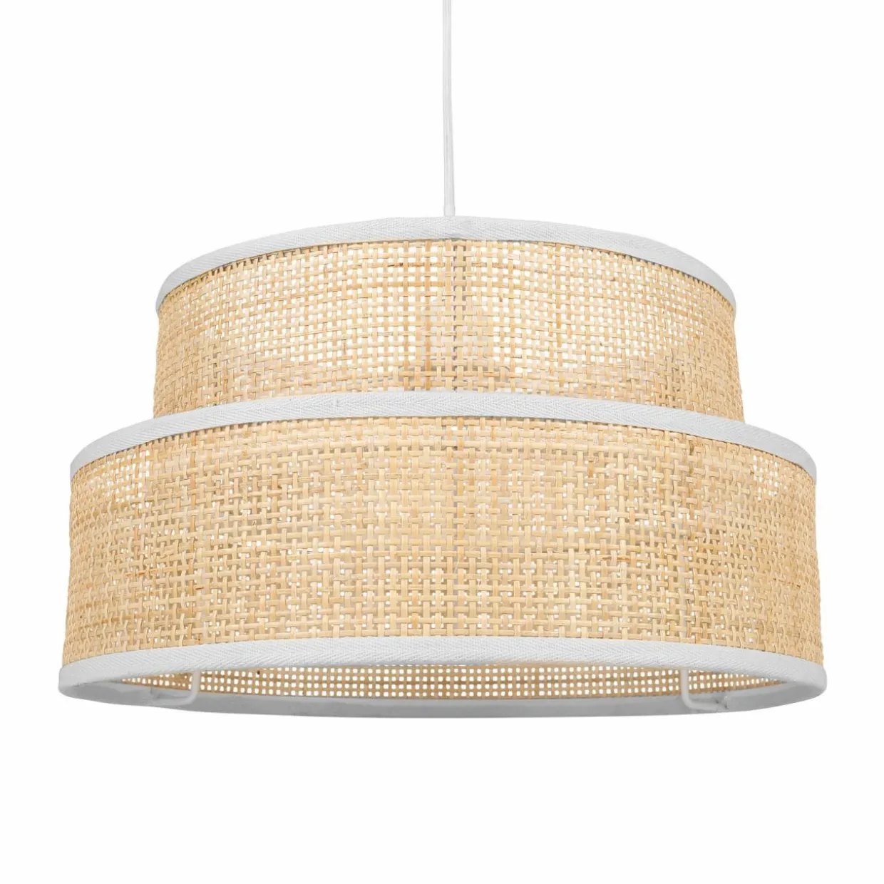 Un style naturel et tendance dans la maison avec cette jolie suspension composée de 2 abats-jour en paille et tissu.
