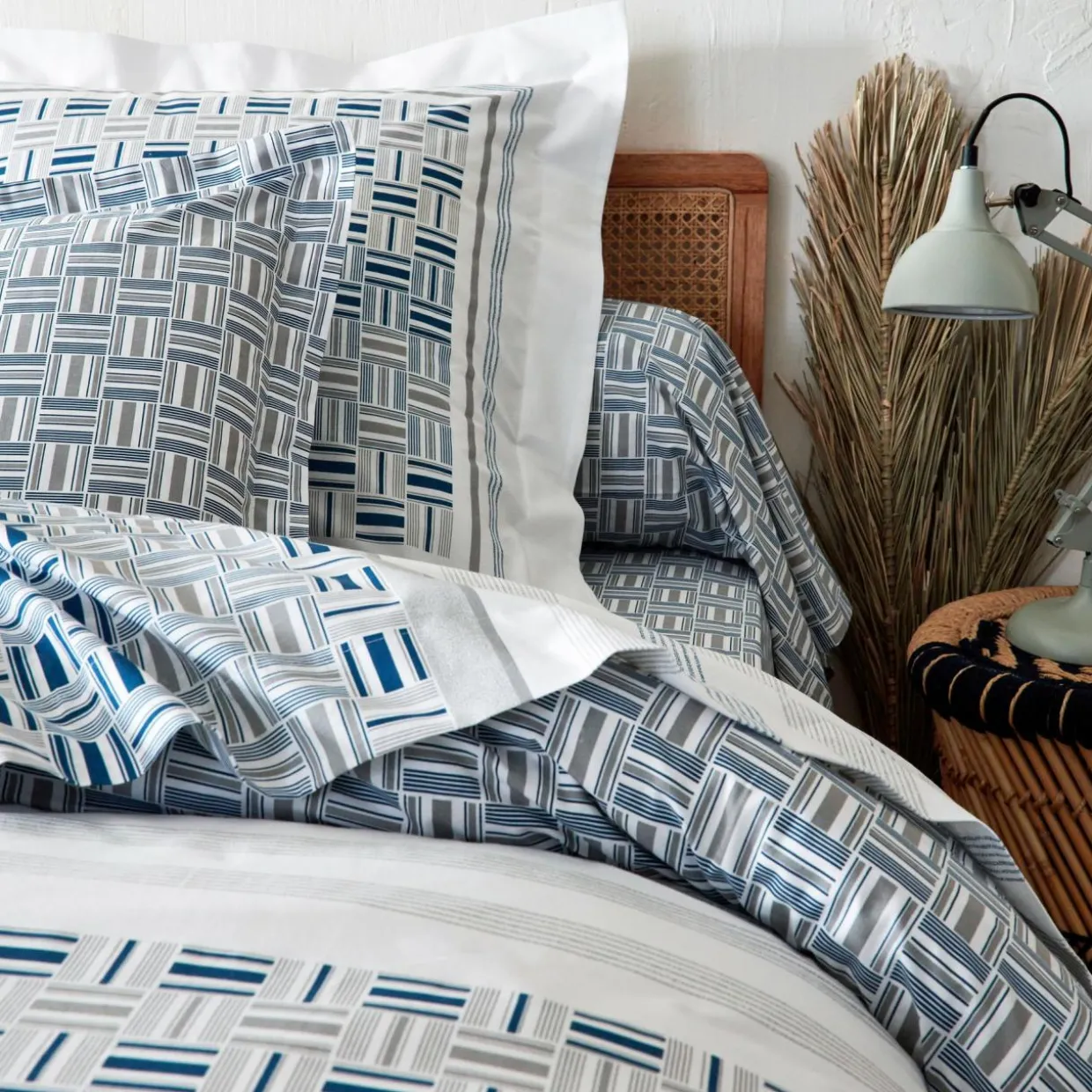 Imprimé : taie à motif feuillage graphique.