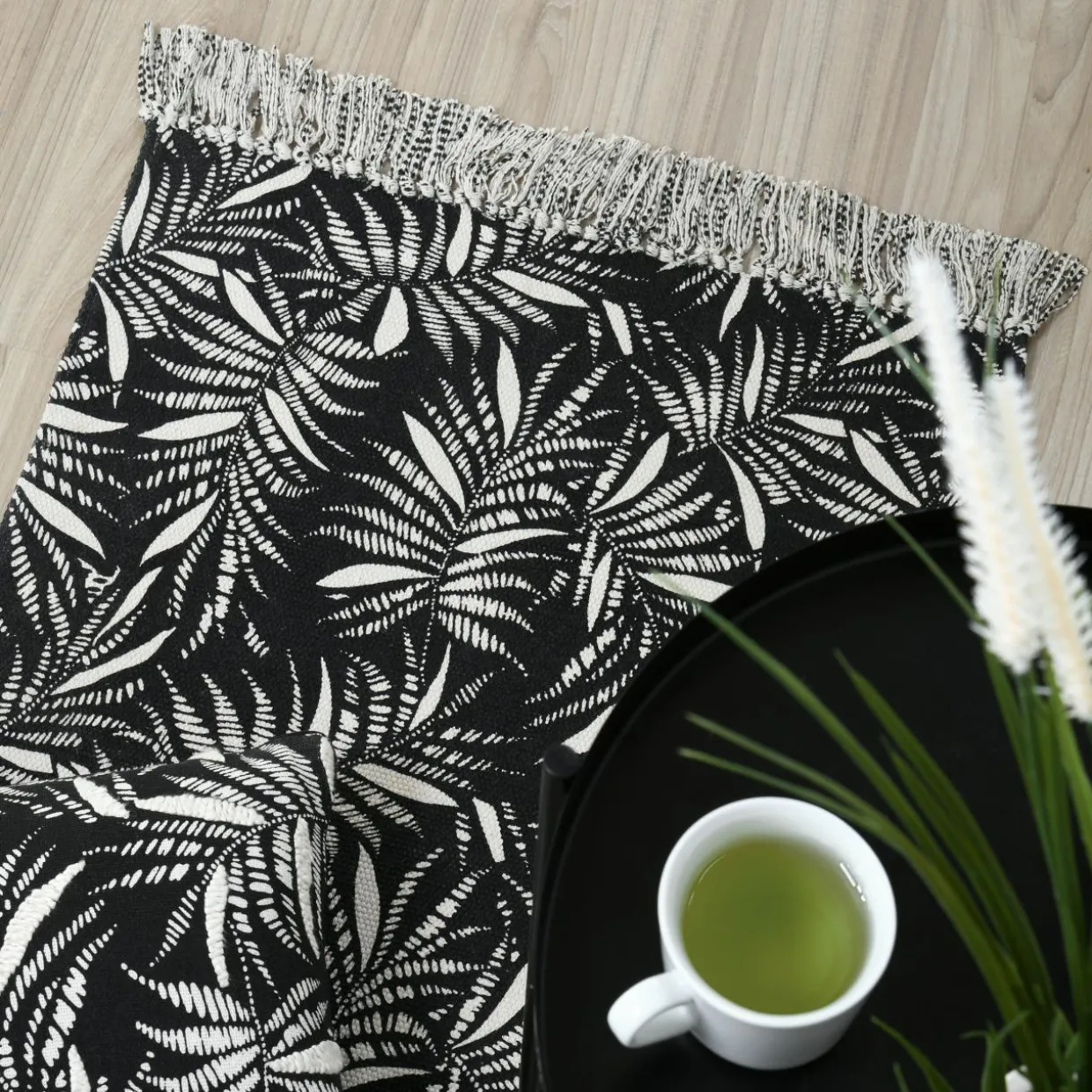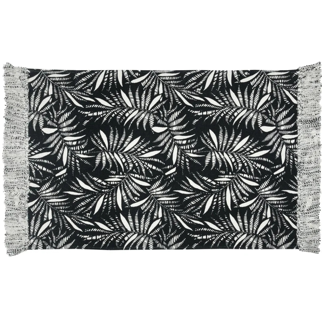 Imprimé : tapis à motif feuillage exotique.