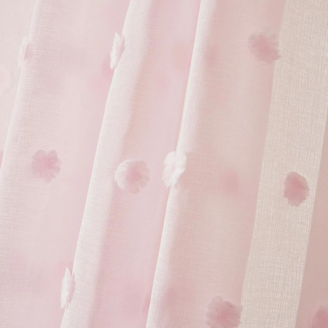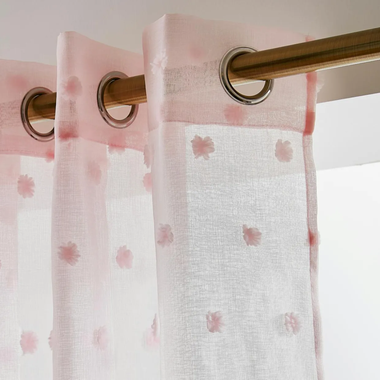Ce voilage, à pompons délicats, possède une texture légère et un aspect vaporeux.