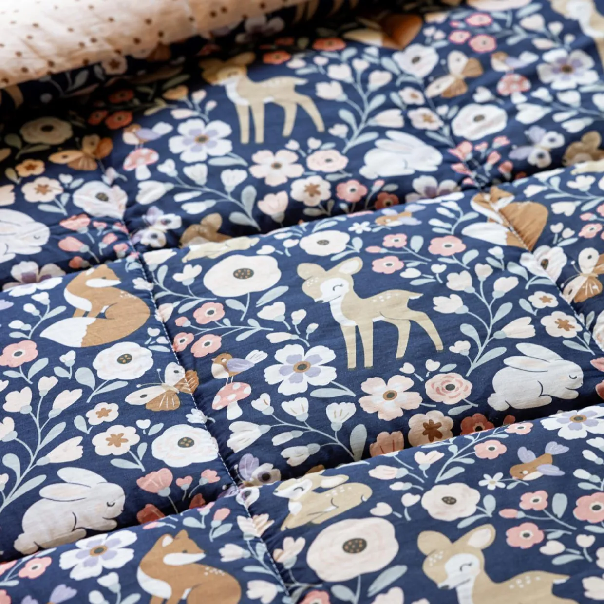 Imprimé : couette réversible à motifs fleurs et animaux.