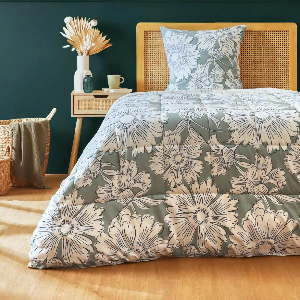 Imprimé : couette à motif floral au recto et rayures au verso.