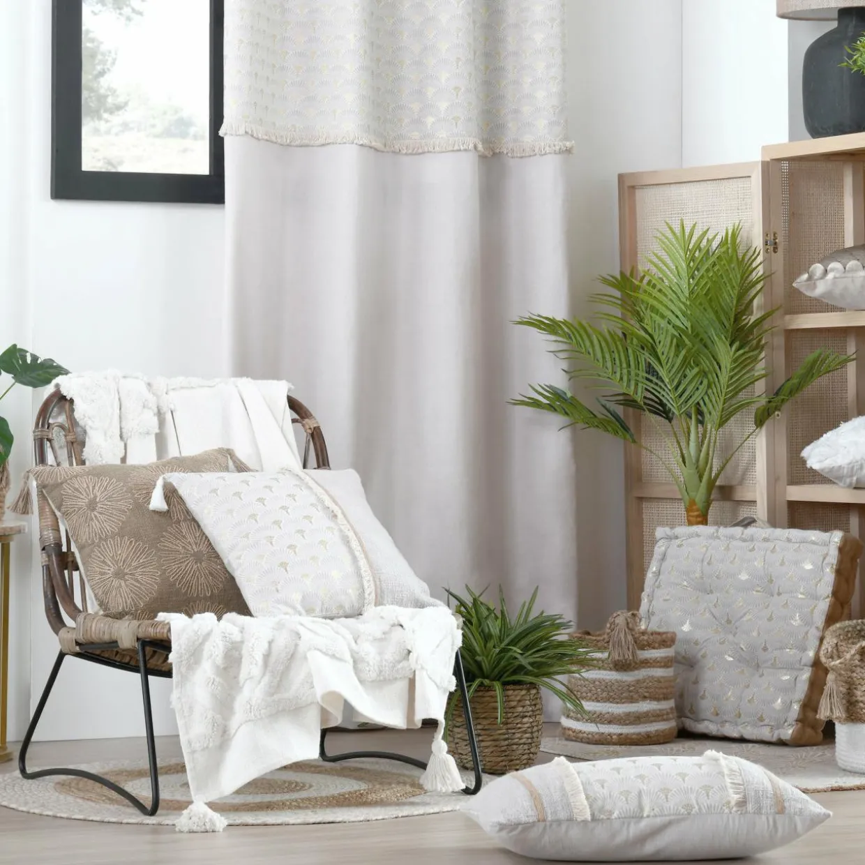 Finition : déhoussable, à pompons, recto à motif et verso uni.