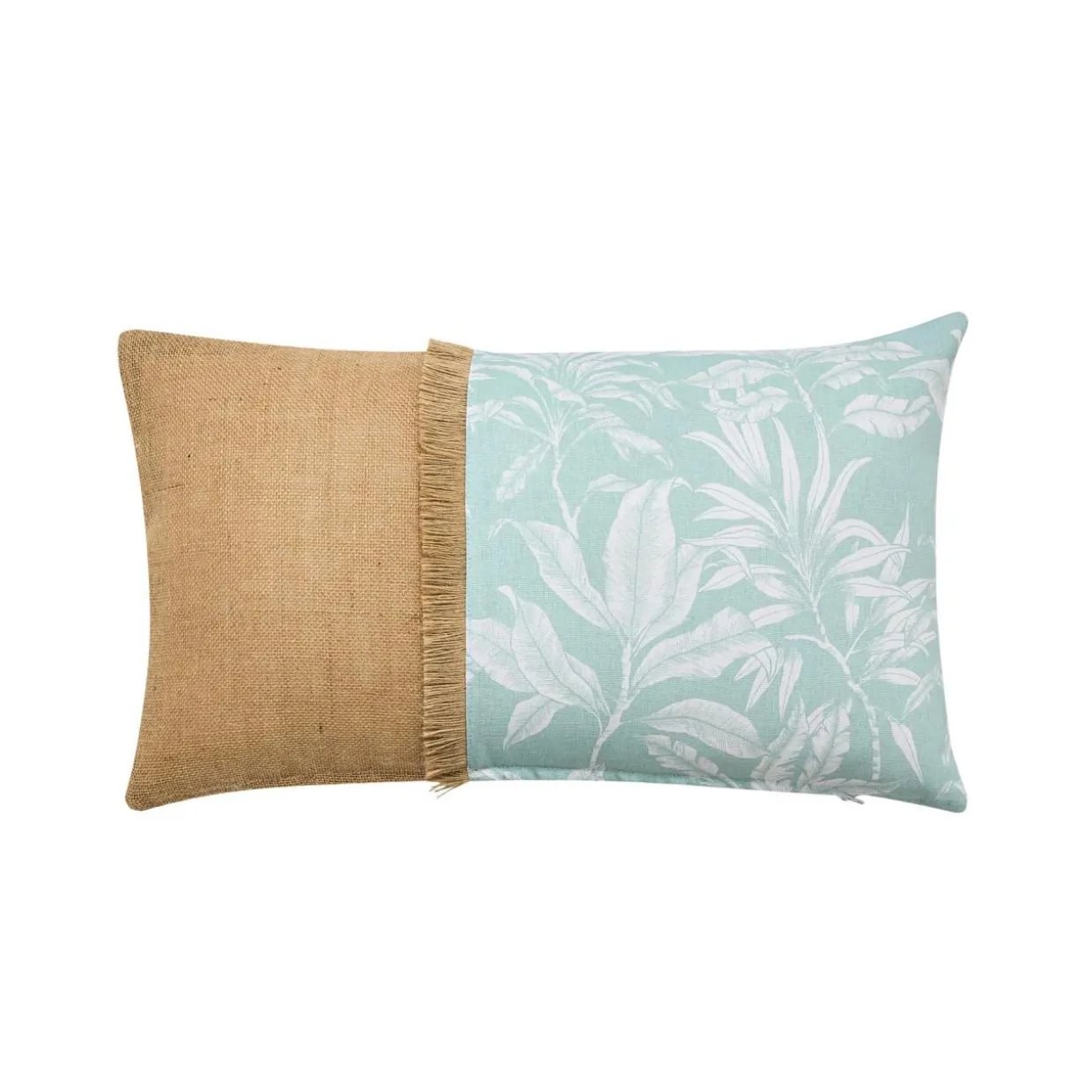Imprimé : coussin à motif exotique au recto et uni au verso.