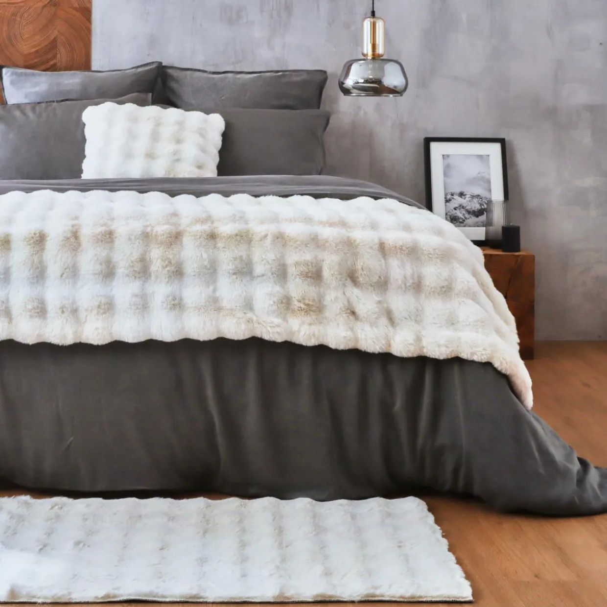 Matière : 100 % polyester, recto fausse fourrure (500 gr/m²), verso flanelle (240 gr/m²).
