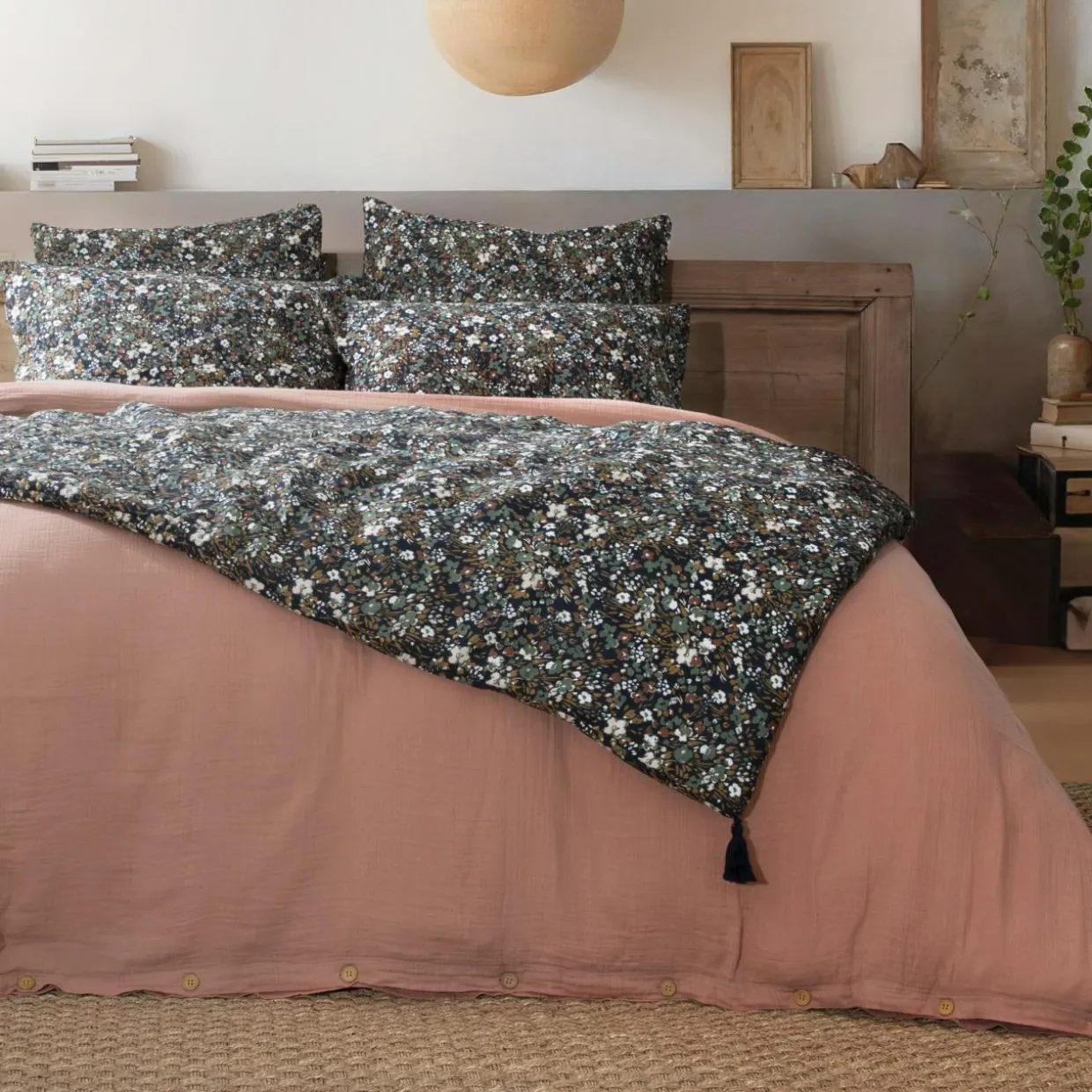 Vous pouvez, au choix, l’associer à du linge de lit en gaze de coton uni ou alors avec le linge de lit de la collection Constance by Eminza.
