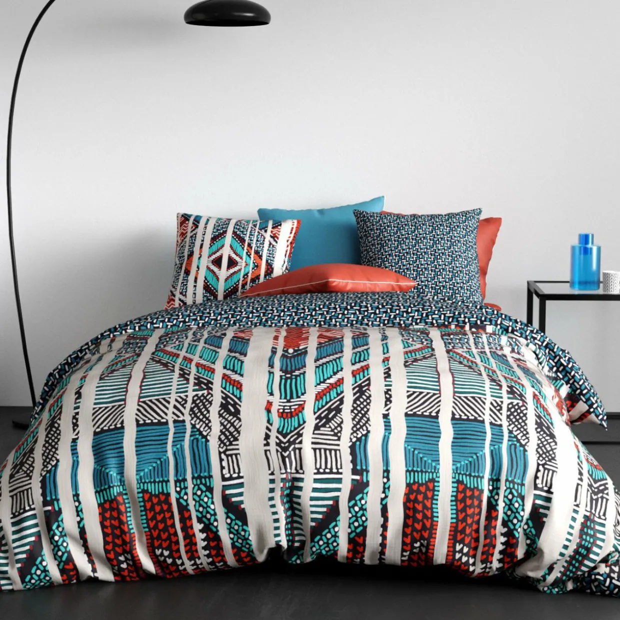 Finition : housse de couette motifs imprimés recto et unie au verso, fermeture à rabat bouteille. Taies d’oreiller à motifs recto / verso, finition portefeuille. Les 2 faces sont visibles sur la photo de l’article (motif aléatoire).