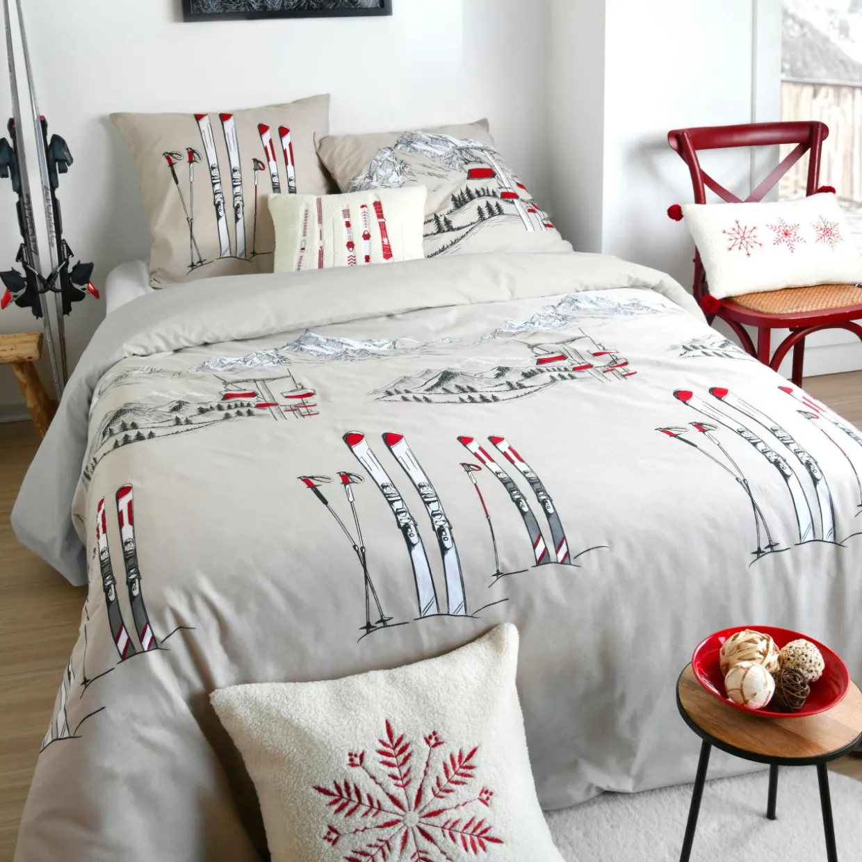 Imprimé : motifs skis rouge et gris.