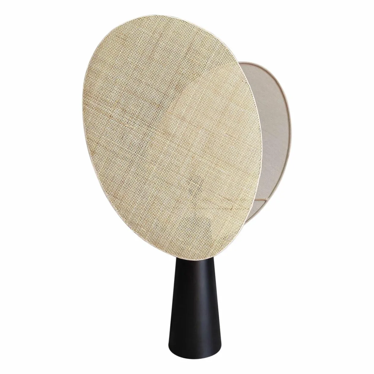 Matière : base en métal et abat-jour en lin et rotin (bambou).