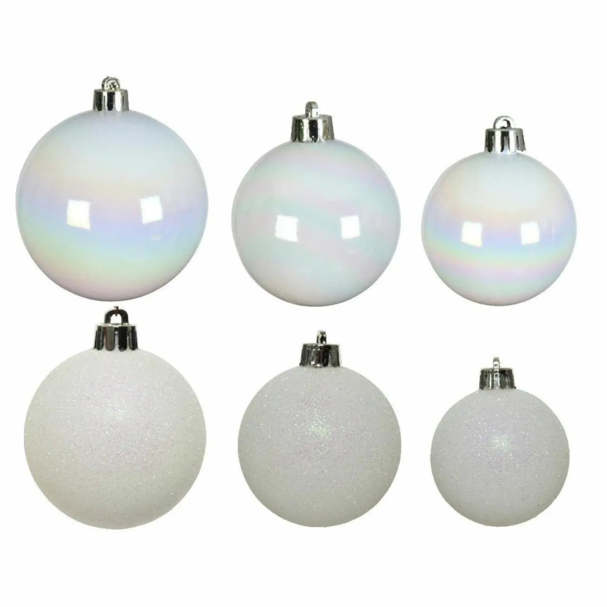 12 boules brillantes (4 de chaque taille) , 9 boules mattes (3 de chaque taille) et 9 boules à paillettes (3 de chaque taille).