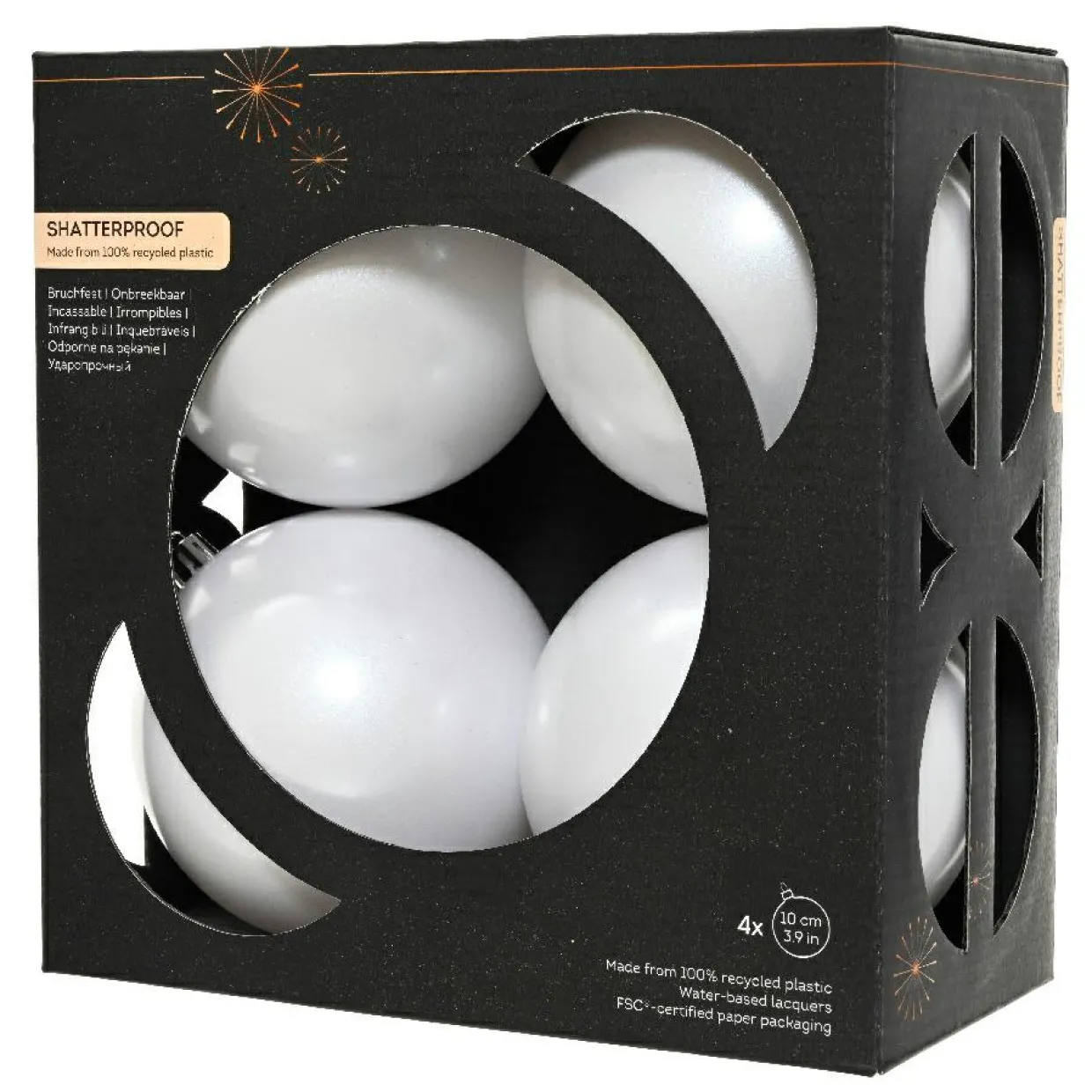 Informations complémentaires : lot de 4 boules de Noël, 2 boules brillantes et 2 boules mates. Suspension incluse, couleur argent. Emballage 100% recyclé certifié FSC.