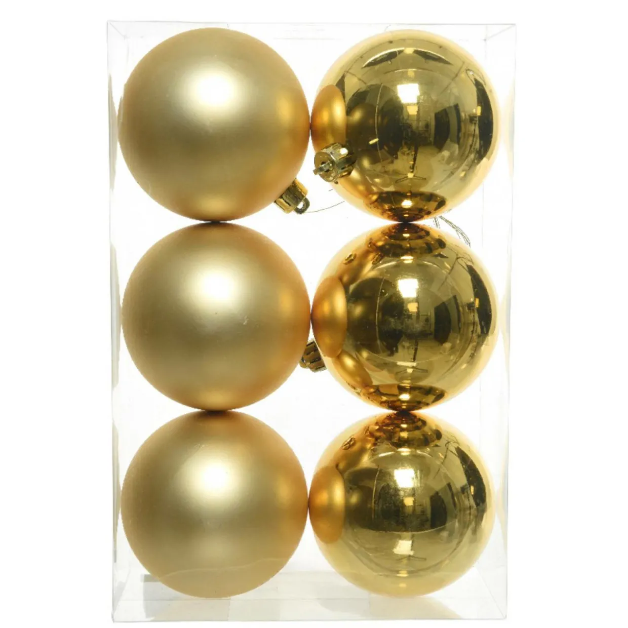 Informations complémentaires : lot de 6 boules de Noël. 3 boules brillantes et 3 boules mates. Livré dans un emballage cartonné 100 % recyclé FSC. Boules munies d’une suspension comprise de couleur or.