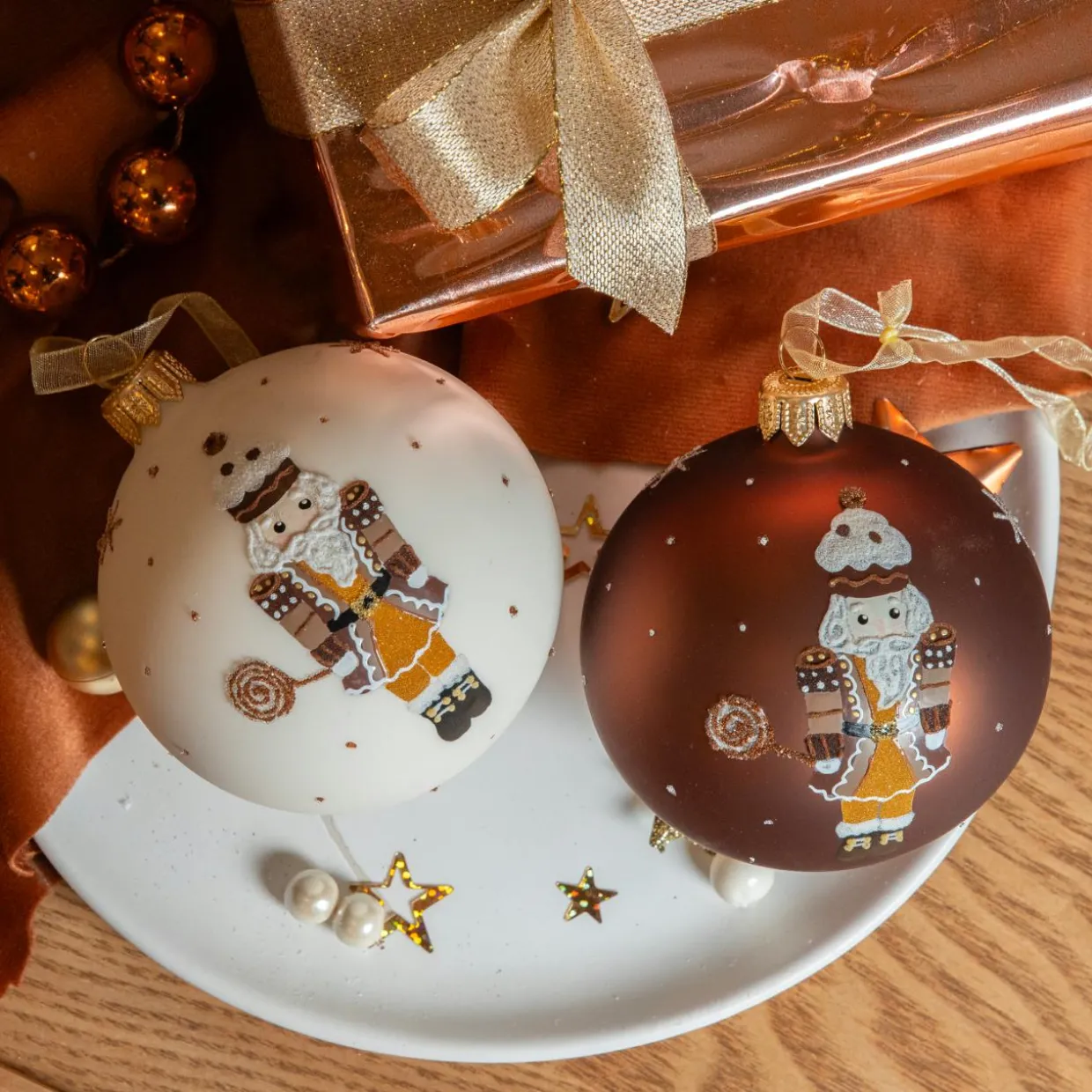 Nous succombons au charme de ces boules de Noël soufflées à la bouche, ornées de motifs attendrissants de soldats casse-noisette gourmands, ajoutant une touche d’élégance à votre décoration festive.