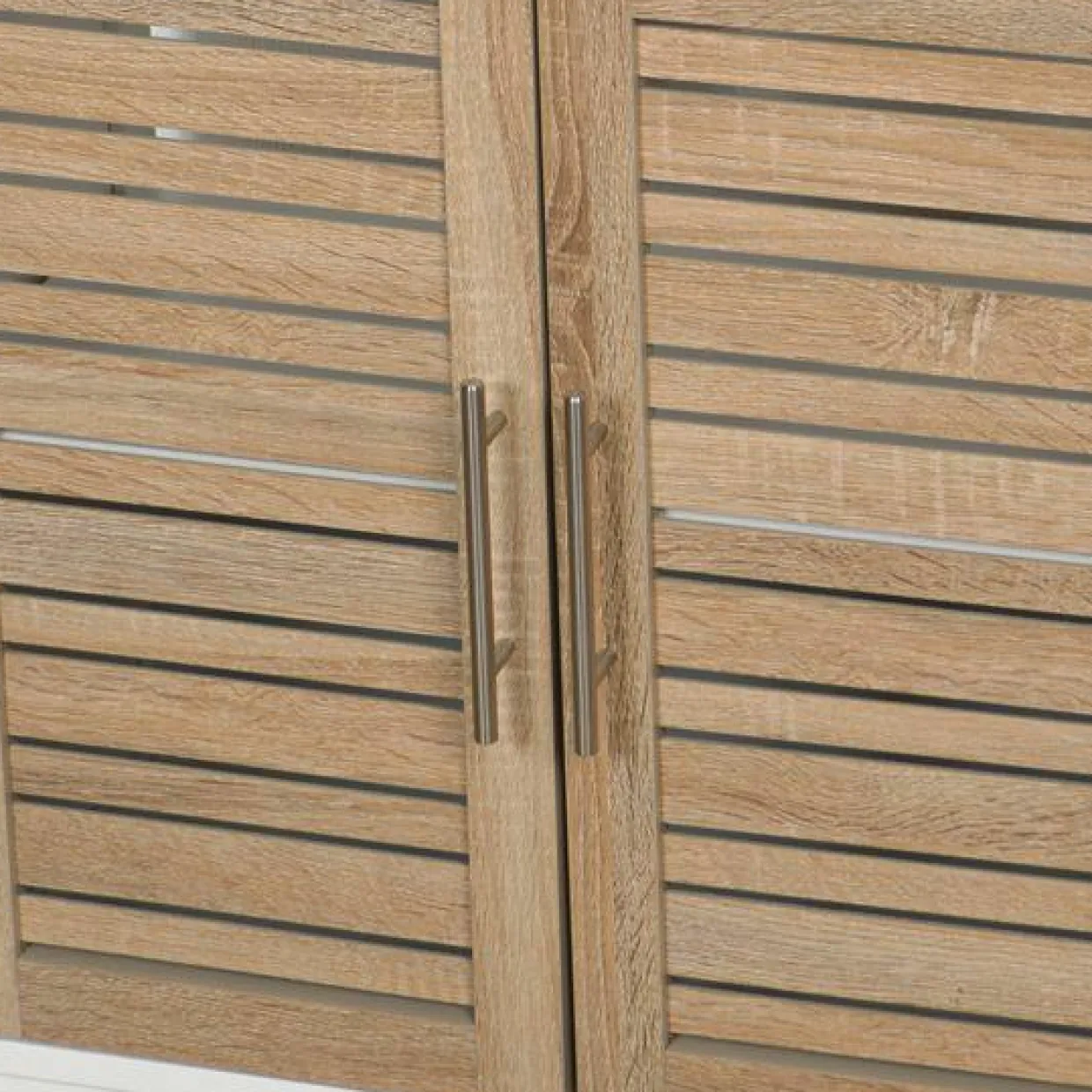 Ce meuble de dessous de lavabo Stockholm est composé de deux portes et d’une étagère intérieure. Une découpe sur le haut du meuble est prévu pour laisser passer les tuyaux du lavabo.