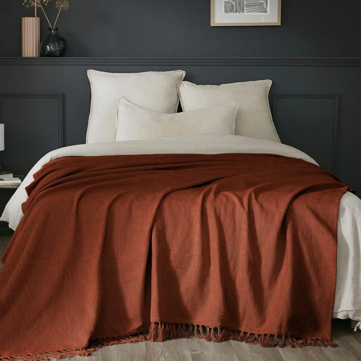 Ce plaid à franges en coton texturé ajoute une touche de charme et de chaleur à votre intérieur, grâce à son tissage délicat et son aspect naturel.