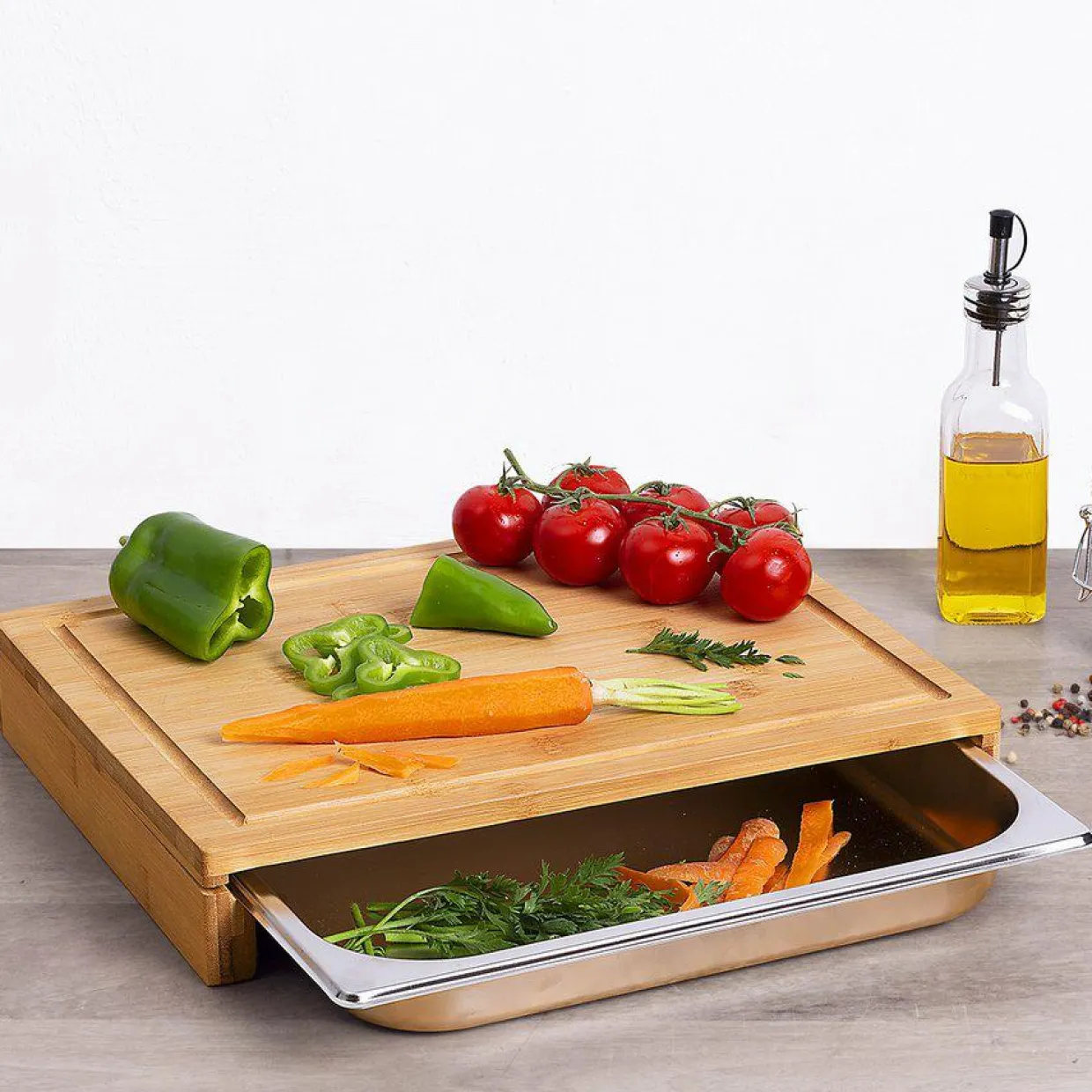 Pratique et élégante, cette planche à découper en bois est équipée d’un bac récupérateur en inox. Idéale pour cuisiner proprement, elle combine fonctionnalité et design pour simplifier vos préparations.