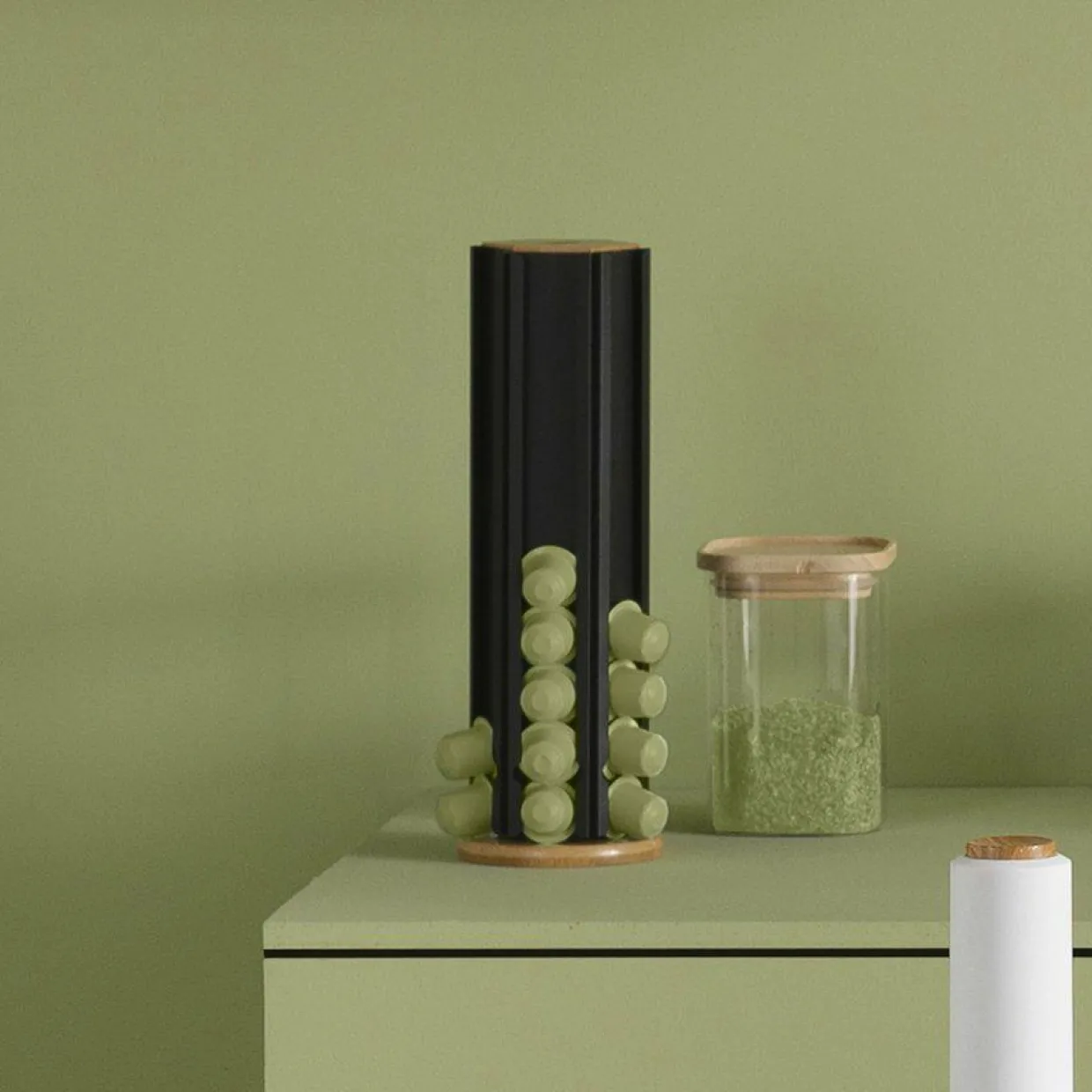 Un porte capsules rotatif qui permet de stocker jusqu’à 60 capsules nespresso.