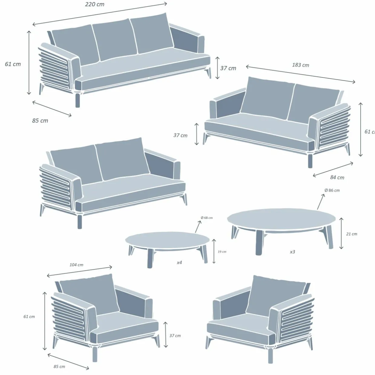 Cette collection allie parfaitement confort et praticité grâce à des matériaux de haute qualité. Conçu pour accueillir jusqu’à 9 personnes, ce salon est idéal pour partager des moments conviviaux en extérieur. Avec ses tissus haut de gamme et sa structure en aluminium, il offre un design élégant qui s’intègre dans tous les styles de jardins ou terrasses. La gamme propose tout ce qu’il faut pour aménager votre espace extérieur : fauteuils, chaises, méridiennes, tables de repas, tables basses et bains de soleil, pour une ambiance chic et confortable.
