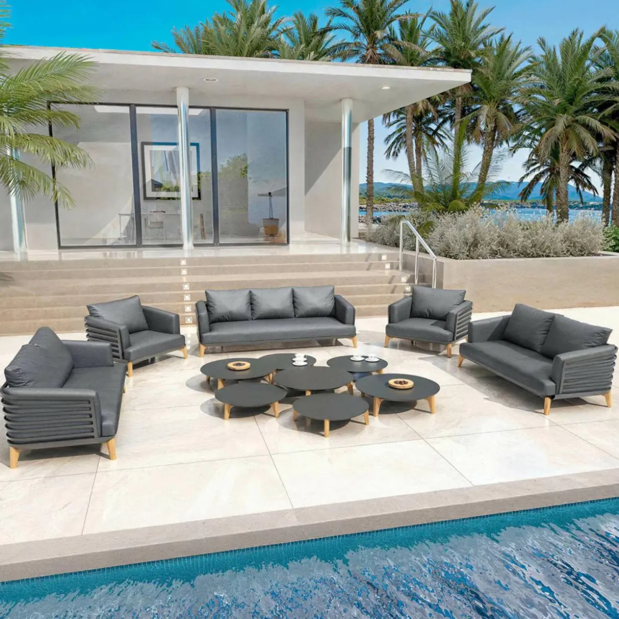 Cette collection allie parfaitement confort et praticité grâce à des matériaux de haute qualité. Conçu pour accueillir jusqu’à 9 personnes, ce salon est idéal pour partager des moments conviviaux en extérieur. Avec ses tissus haut de gamme et sa structure en aluminium, il offre un design élégant qui s’intègre dans tous les styles de jardins ou terrasses. La gamme propose tout ce qu’il faut pour aménager votre espace extérieur : fauteuils, chaises, méridiennes, tables de repas, tables basses et bains de soleil, pour une ambiance chic et confortable.