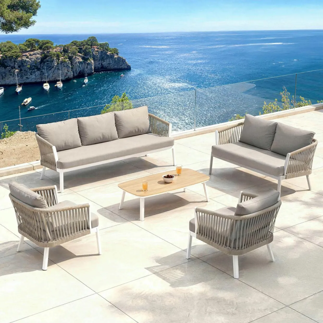 Il comprend : un canapé 3 places, un canapé 2 places, deux fauteuils et une table basse rectangulaire.
