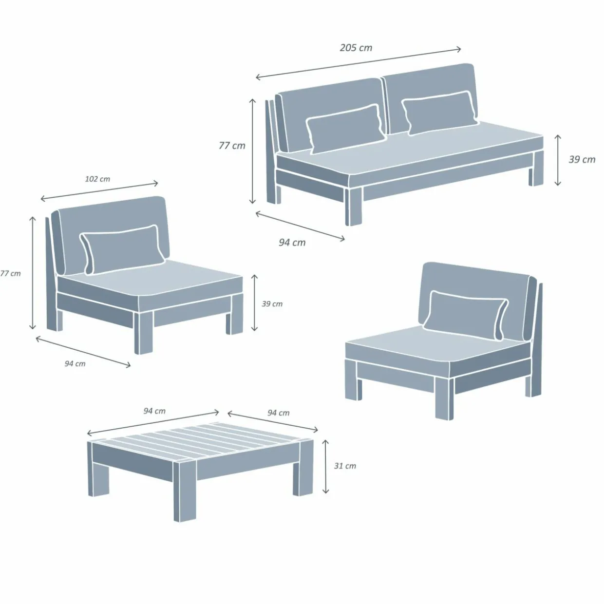 – Une table : longueur 94 x profondeur 94 x hauteur 31 cm.