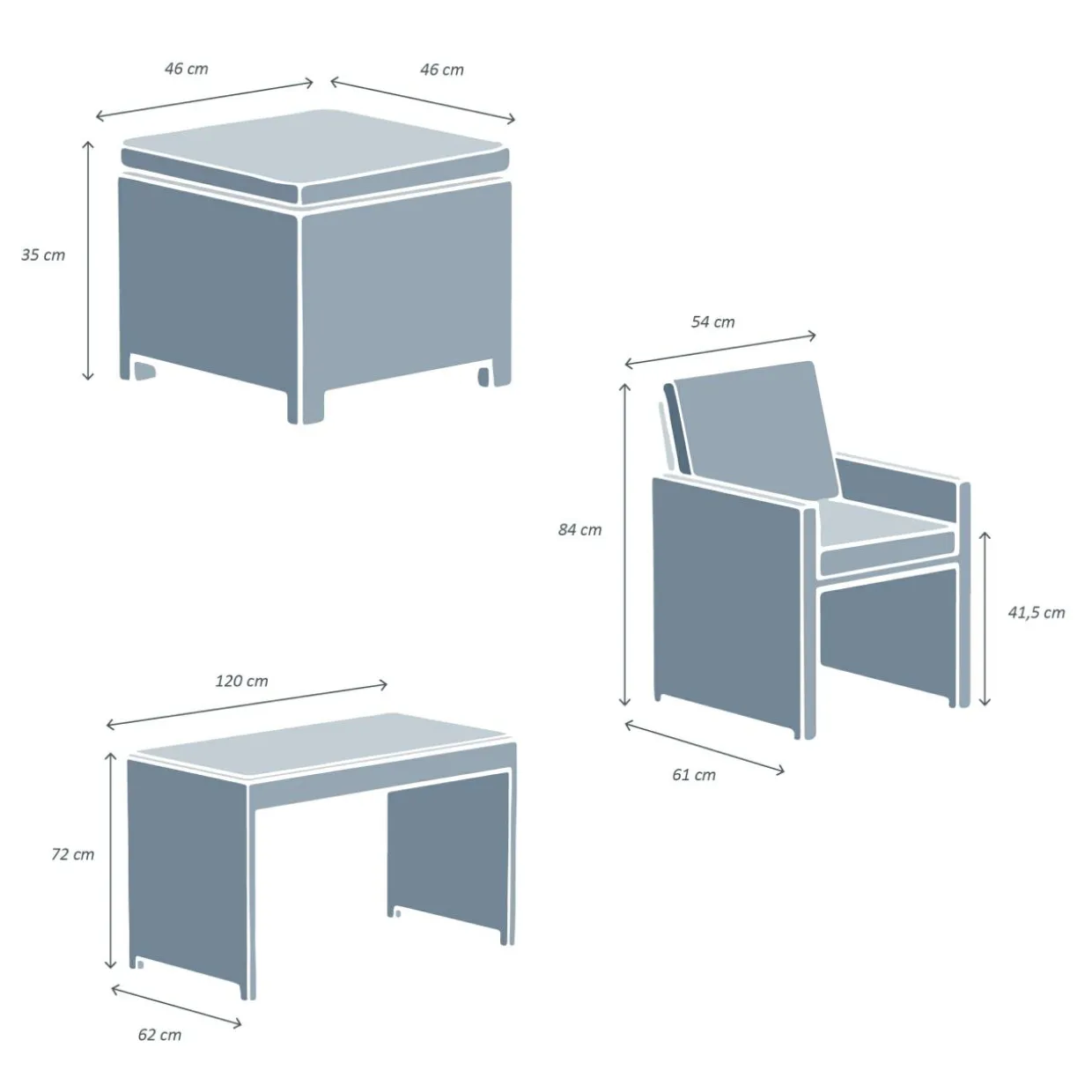– Fauteuils : longueur 61 cm x profondeur 54 cm x hauteur 84 cm.