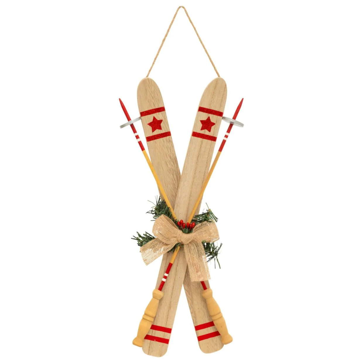 Cette suspension de Noël déco en forme de paire de ski en bois naturel apportera une touche chaleureuse et authentique à votre décoration de Noël. Son design épuré et sa couleur naturelle s’intégreront parfaitement dans tout type d’intérieur.