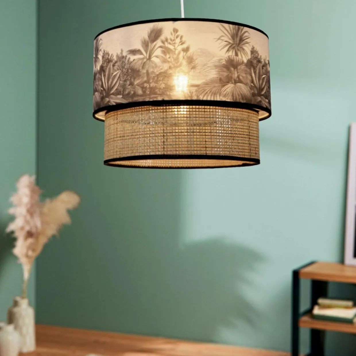 La suspension Ombrage en rotin et tissu apporte un style très exotique à votre intérieur, avec ses 2 abats-jour et ses motifs palmiers.
